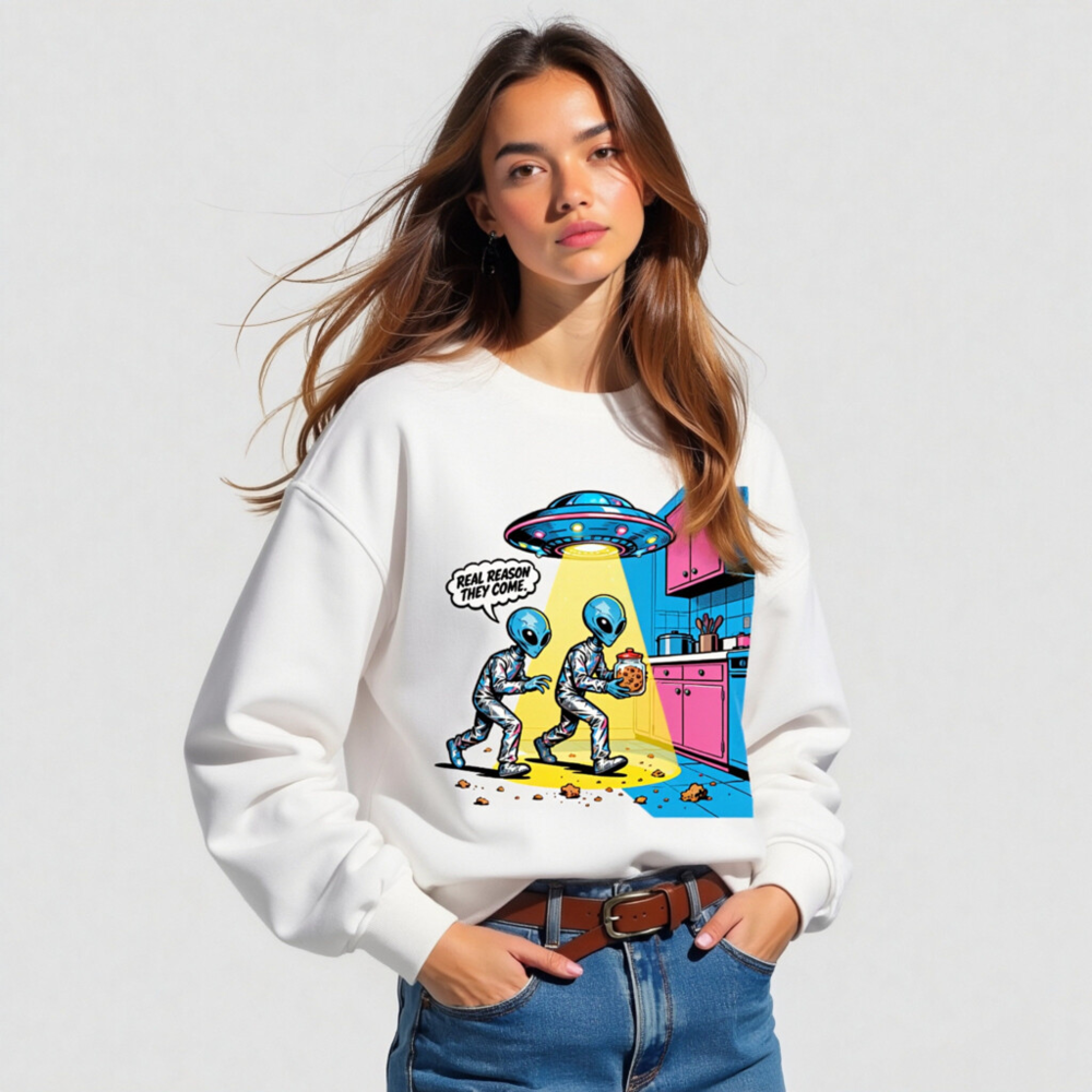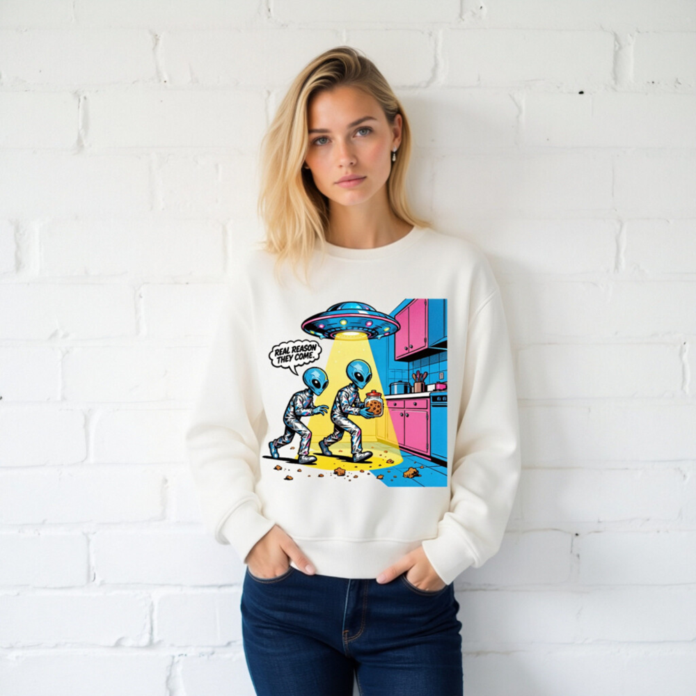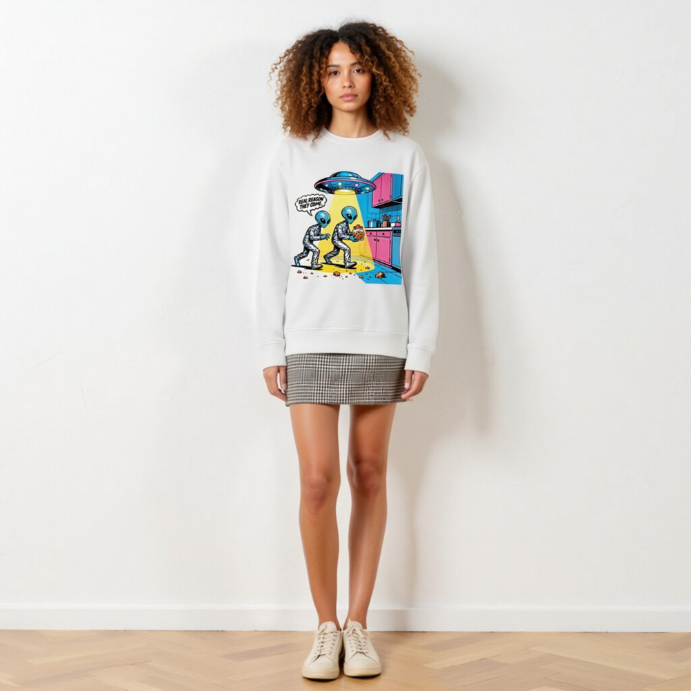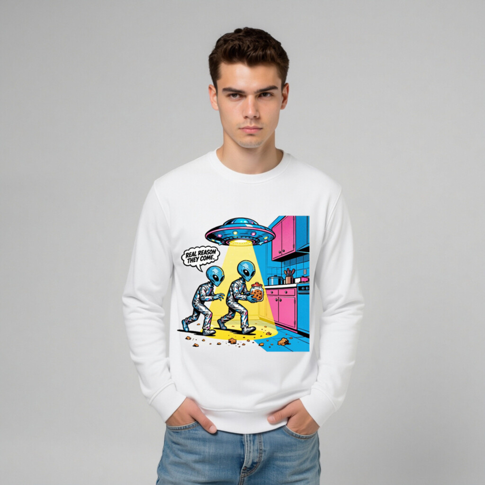 This unisex organic sweatshirt features a vibrant, retro-style alien cartoon design—two blue aliens stealing cookies under a UFO beam, with the witty caption ‘REAL REASON THEY COME.’ Made from certified organic cotton, it’s soft, sustainable, and perfect for sci-fi fans. Ideal for casual wear, gifts, or everyday comfort. Machine washable. Size: S–XXL.