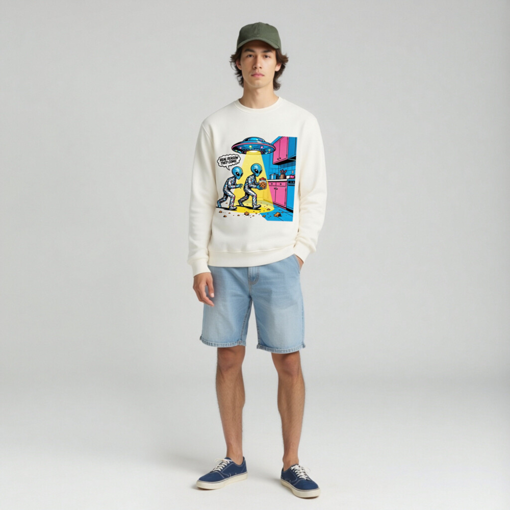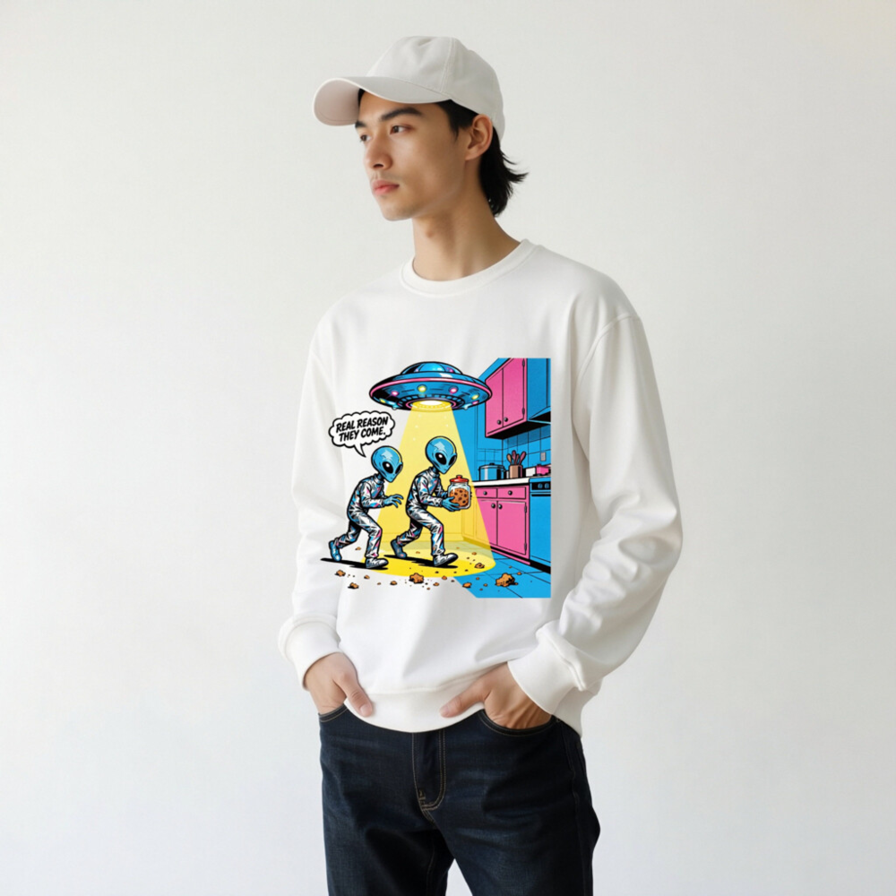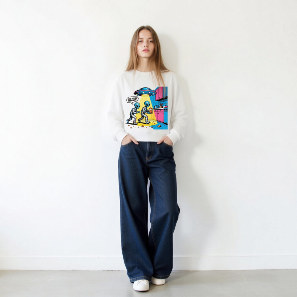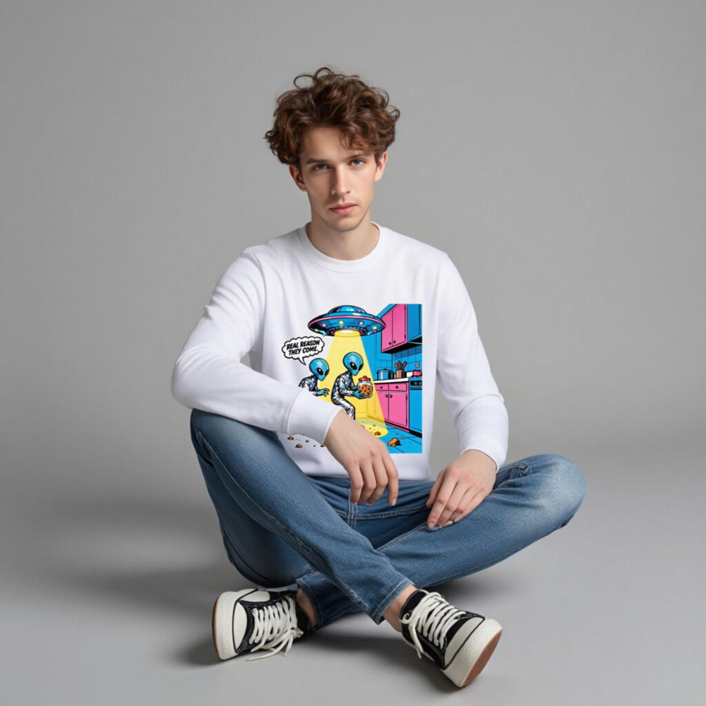 This unisex organic sweatshirt features a vibrant, retro-style alien cartoon design—two blue aliens stealing cookies under a UFO beam, with the witty caption ‘REAL REASON THEY COME.’ Made from certified organic cotton, it’s soft, sustainable, and perfect for sci-fi fans. Ideal for casual wear, gifts, or everyday comfort. Machine washable. Size: S–XXL.