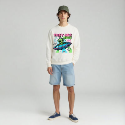 Wear this unisex organic sweatshirt featuring a playful green alien in a blue UFO with party hat and floating papers. Made from certified organic cotton, it’s soft, sustainable, and perfect for casual wear. The vibrant, cartoon-style print adds fun to any outfit—ideal for space lovers and eco-conscious shoppers. Size: S–XXL. Machine washable. Ethically produced.