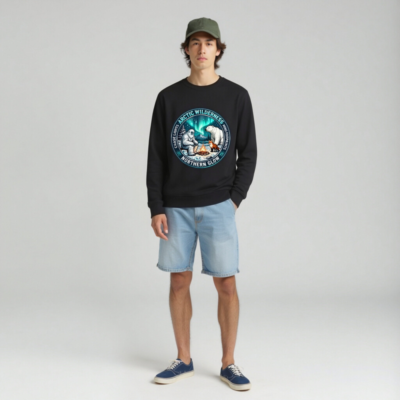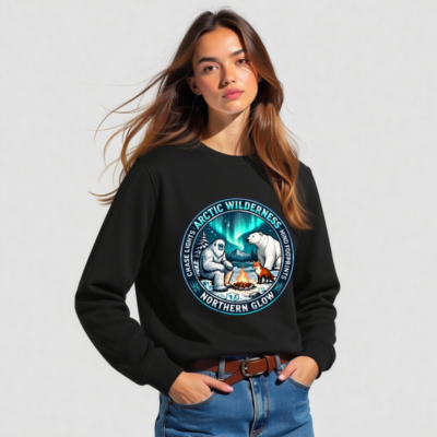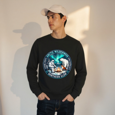 Wear the magic of the Arctic wilderness with this unisex organic sweatshirt. Featuring a vibrant circular design showcasing a yeti, polar bear, and fox gathered around a campfire under the aurora borealis—inspired by ‘Arctic Wilderness’ and ‘Northern Glow’. Crafted for comfort and sustainability, it’s perfect for nature lovers seeking cozy, eco-conscious style.