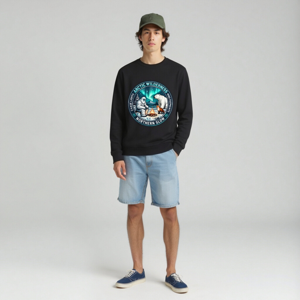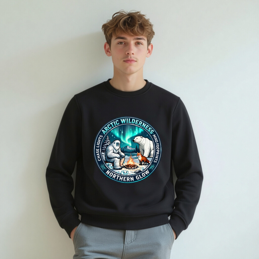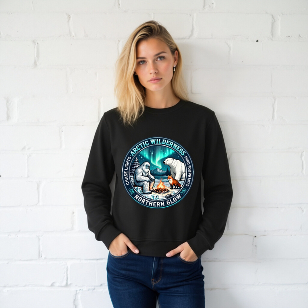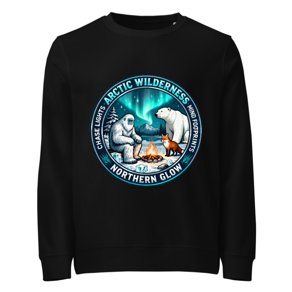 Unisex Organic Sweatshirt | Arctic Wilderness Northern Glow Design with Yeti, Polar Bear & Fox