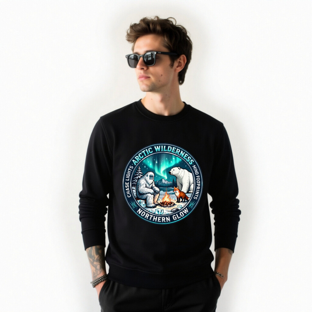 Wear the magic of the Arctic wilderness with this unisex organic sweatshirt. Featuring a vibrant circular design showcasing a yeti, polar bear, and fox gathered around a campfire under the aurora borealis—inspired by ‘Arctic Wilderness’ and ‘Northern Glow’. Crafted for comfort and sustainability, it’s perfect for nature lovers seeking cozy, eco-conscious style.
