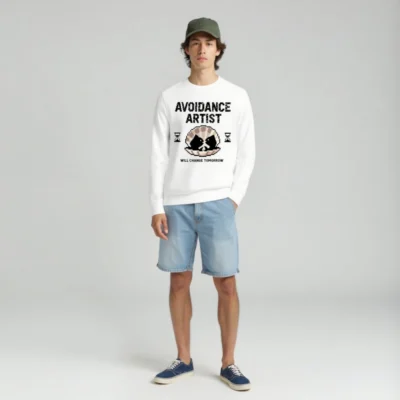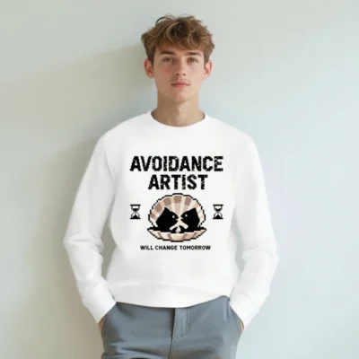 Wear sustainable style with this unisex organic sweatshirt featuring a bold pixel-art design: two cats in a shell flanked by hourglasses, under the phrase ‘AVOIDANCE ARTIST WILL CHANGE TOMORROW’. Crafted for comfort and conscience—made from certified organic cotton. Ideal for eco-conscious fashion lovers seeking unique, statement apparel that aligns with mindful living.