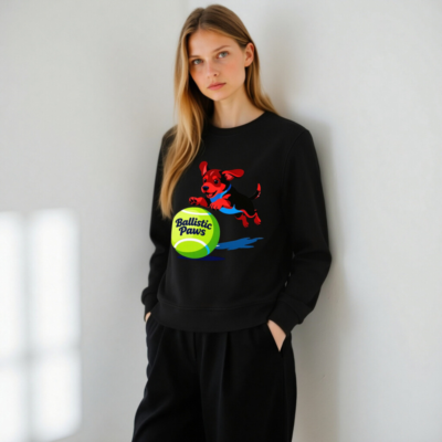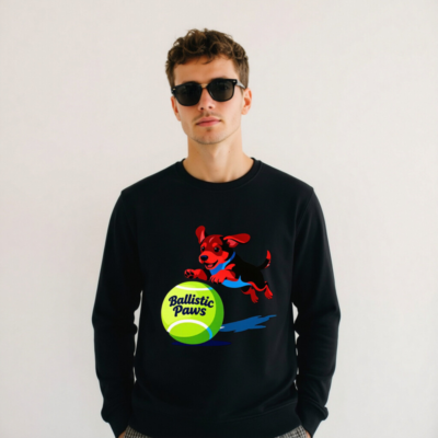 This unisex organic sweatshirt features a playful red-and-black puppy leaping over a bright green tennis ball with ‘Ballistic Paws’ text. Made from certified organic cotton, it offers comfort and sustainability for everyday wear. The vibrant graphic design appeals to pet lovers and sports enthusiasts alike. Soft, durable, and eco-friendly—perfect for casual style with purpose.