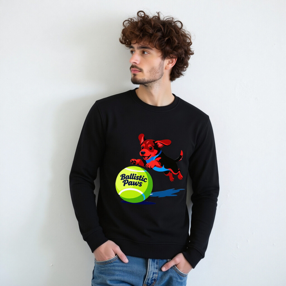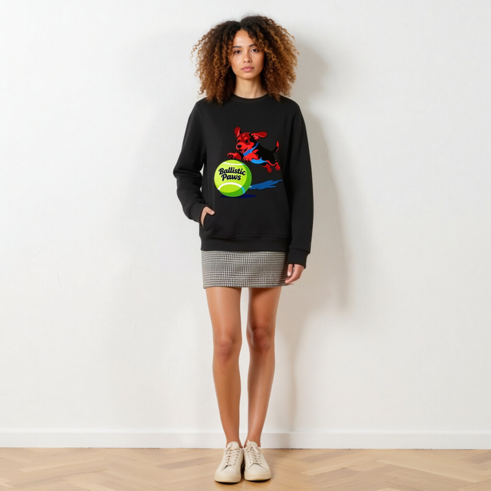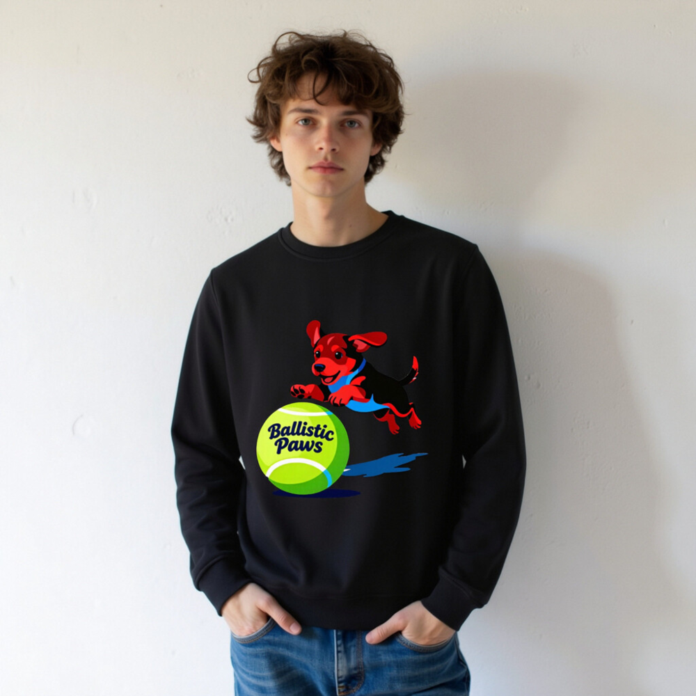 This unisex organic sweatshirt features a playful red-and-black puppy leaping over a bright green tennis ball with ‘Ballistic Paws’ text. Made from certified organic cotton, it offers comfort and sustainability for everyday wear. The vibrant graphic design appeals to pet lovers and sports enthusiasts alike. Soft, durable, and eco-friendly—perfect for casual style with purpose.