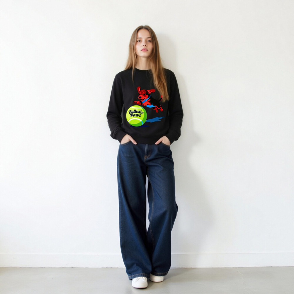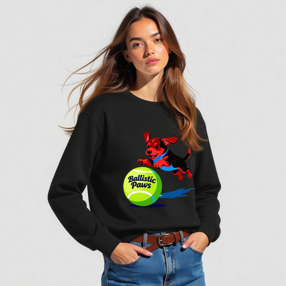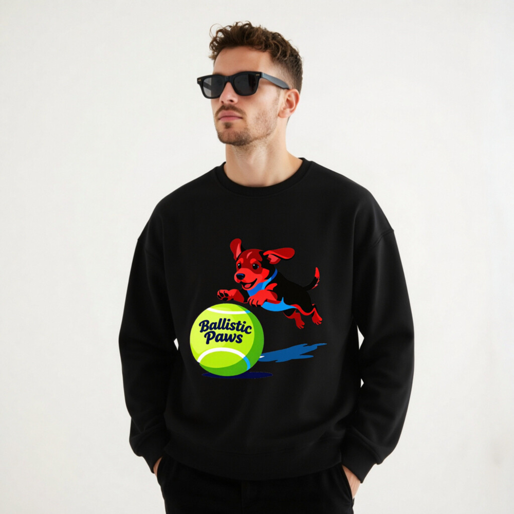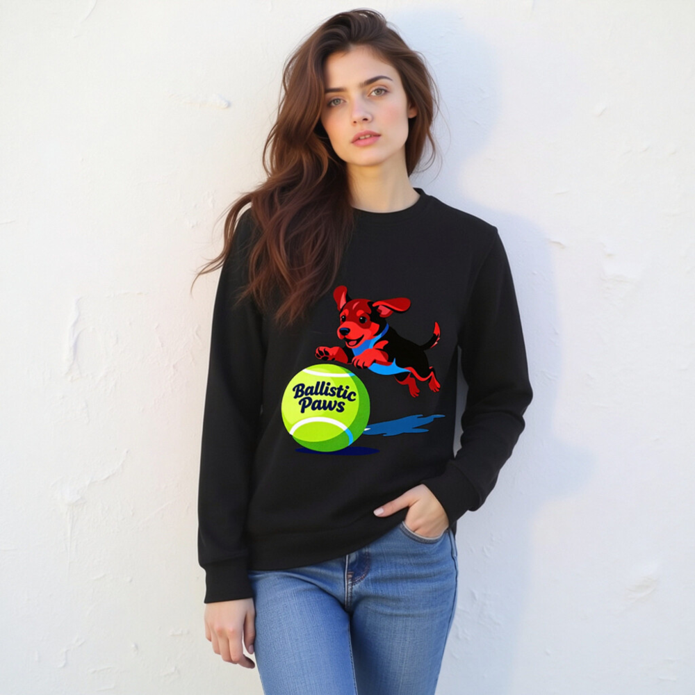 This unisex organic sweatshirt features a playful red-and-black puppy leaping over a bright green tennis ball with ‘Ballistic Paws’ text. Made from certified organic cotton, it offers comfort and sustainability for everyday wear. The vibrant graphic design appeals to pet lovers and sports enthusiasts alike. Soft, durable, and eco-friendly—perfect for casual style with purpose.