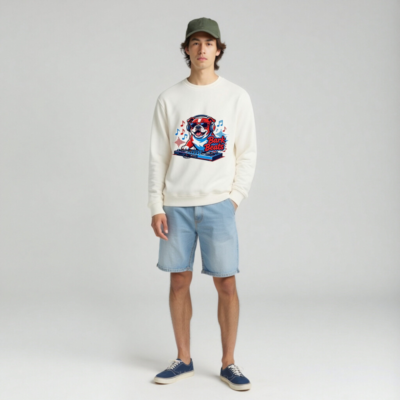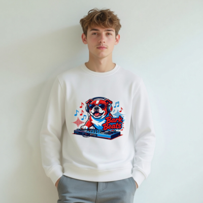 Wear the fun with this unisex organic sweatshirt featuring a vibrant ‘Bark Beats’ DJ bulldog graphic—headphones, turntables, and music notes in bold red, white & blue. Made from certified organic cotton for comfort and sustainability. Perfect for music lovers and pet enthusiasts seeking stylish, eco-friendly apparel. Lightweight, soft, and designed for everyday wear.