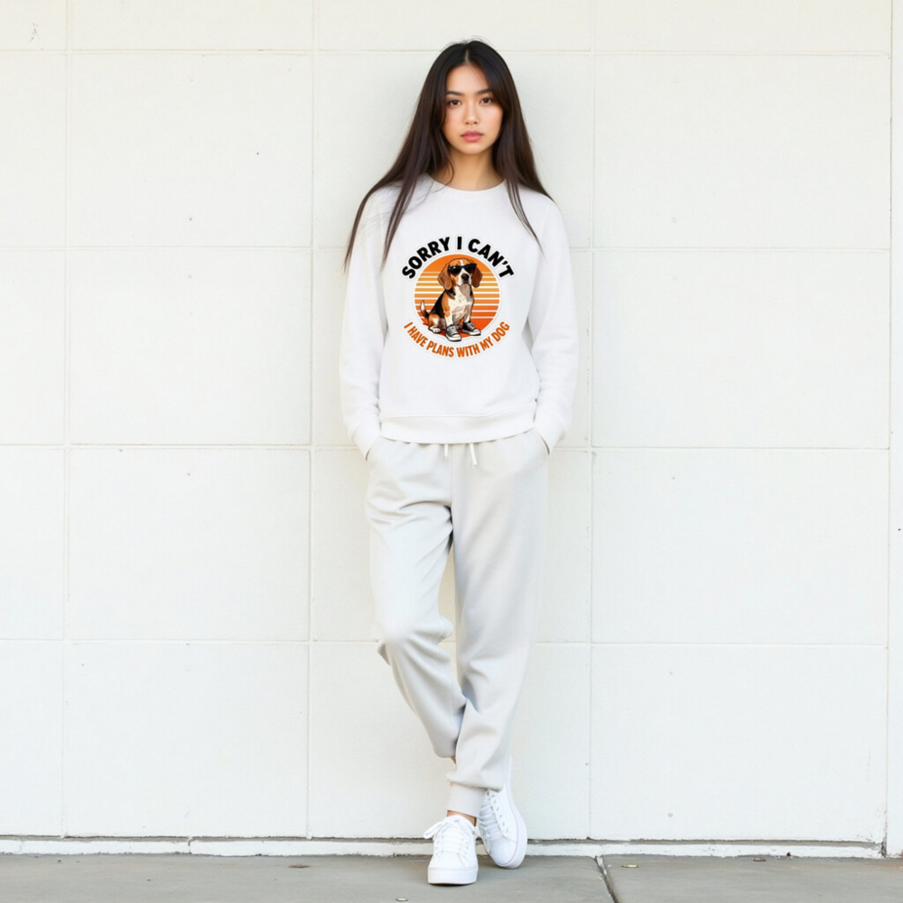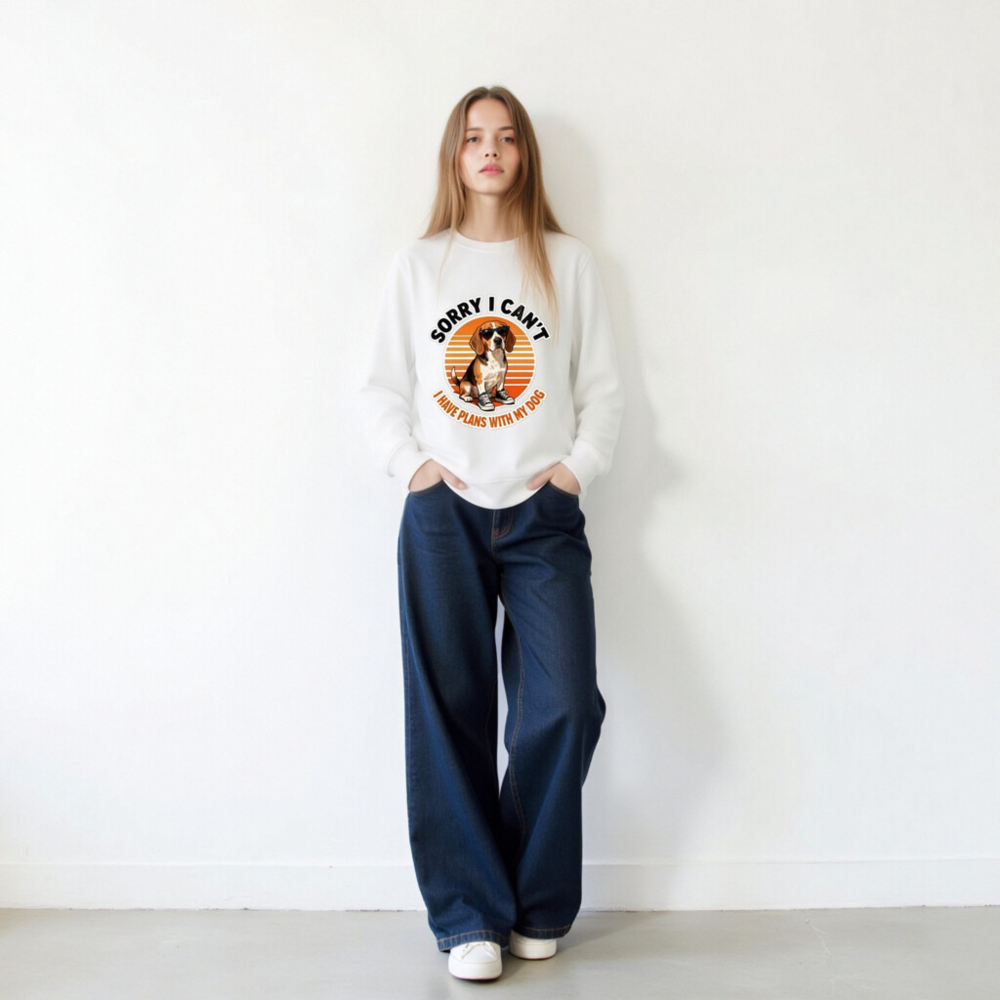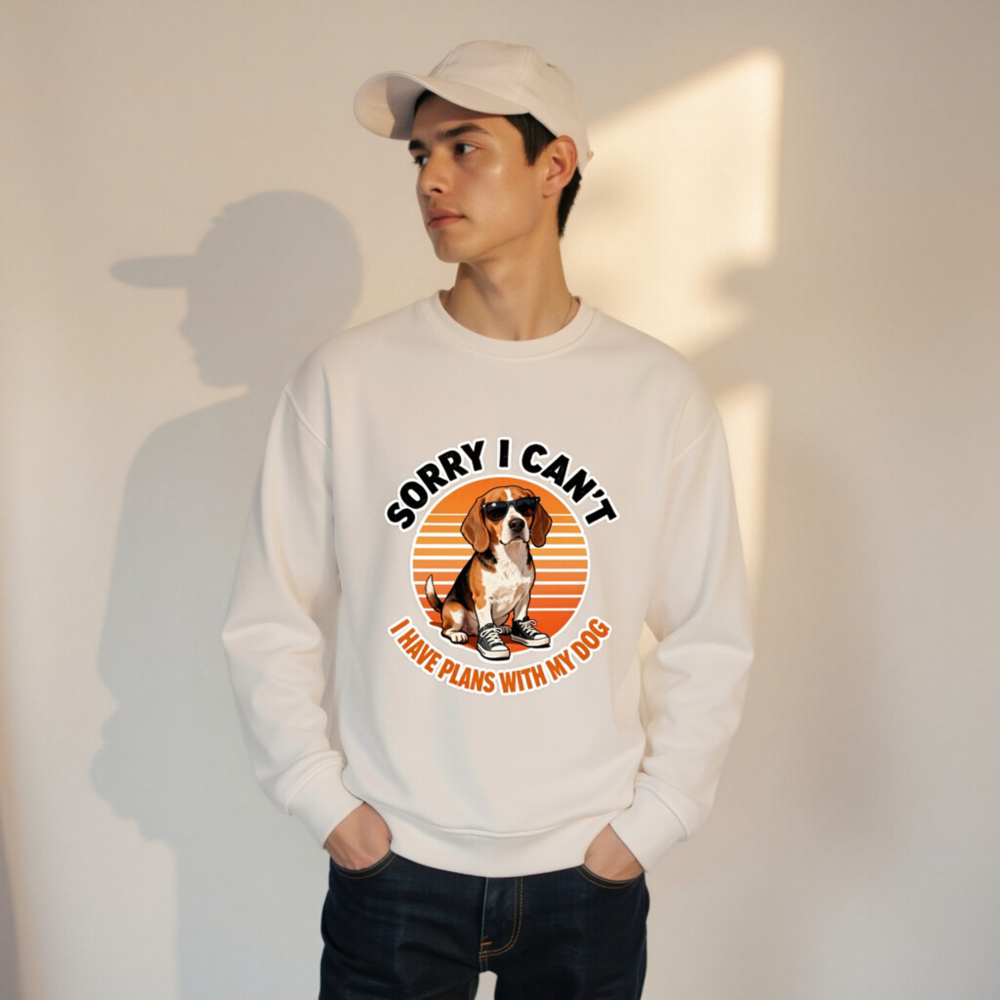 Wear your love for dogs in style with this unisex organic sweatshirt. Featuring a retro sunset design of a beagle in sunglasses and sneakers, paired with the playful quote ‘Sorry I Can’t, I Have Plans With My Dog.’ Soft, eco-friendly cotton blend—comfortable, sustainable, and perfect for dog lovers. Ideal for casual wear or gifting to pet enthusiasts.