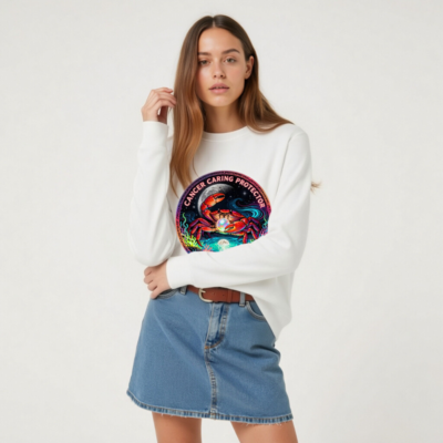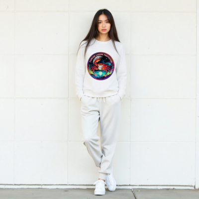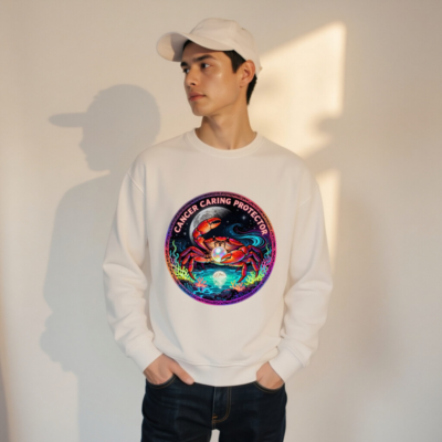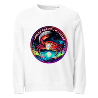 Wear the Cancer Caring Protector design: a vibrant, cosmic crab holding a pearl under moonlight, surrounded by neon coral and ocean waves. This unisex organic sweatshirt features soft, eco-friendly fabric with ethical production. Perfect for astrology lovers, cancer supporters, or anyone seeking meaningful, artistic apparel. Sustainable style with symbolic meaning—crafted for comfort and purpose.