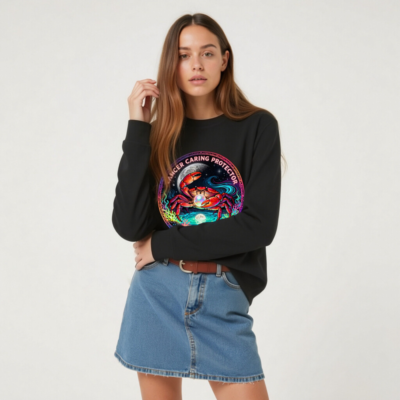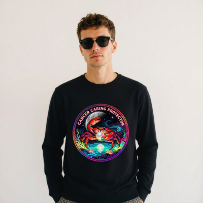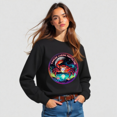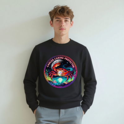 Wear the Cancer zodiac symbol with pride: this unisex organic sweatshirt features a vibrant, cosmic crab holding a pearl under moonlight—symbolizing care, protection, and intuition. Made from certified organic cotton, it’s soft, sustainable, and designed for comfort. The bold ‘Cancer Caring Protector’ text wraps the artwork, blending astrology, art, and eco-conscious style. Ideal for zodiac lovers seeking meaningful, ethical apparel.