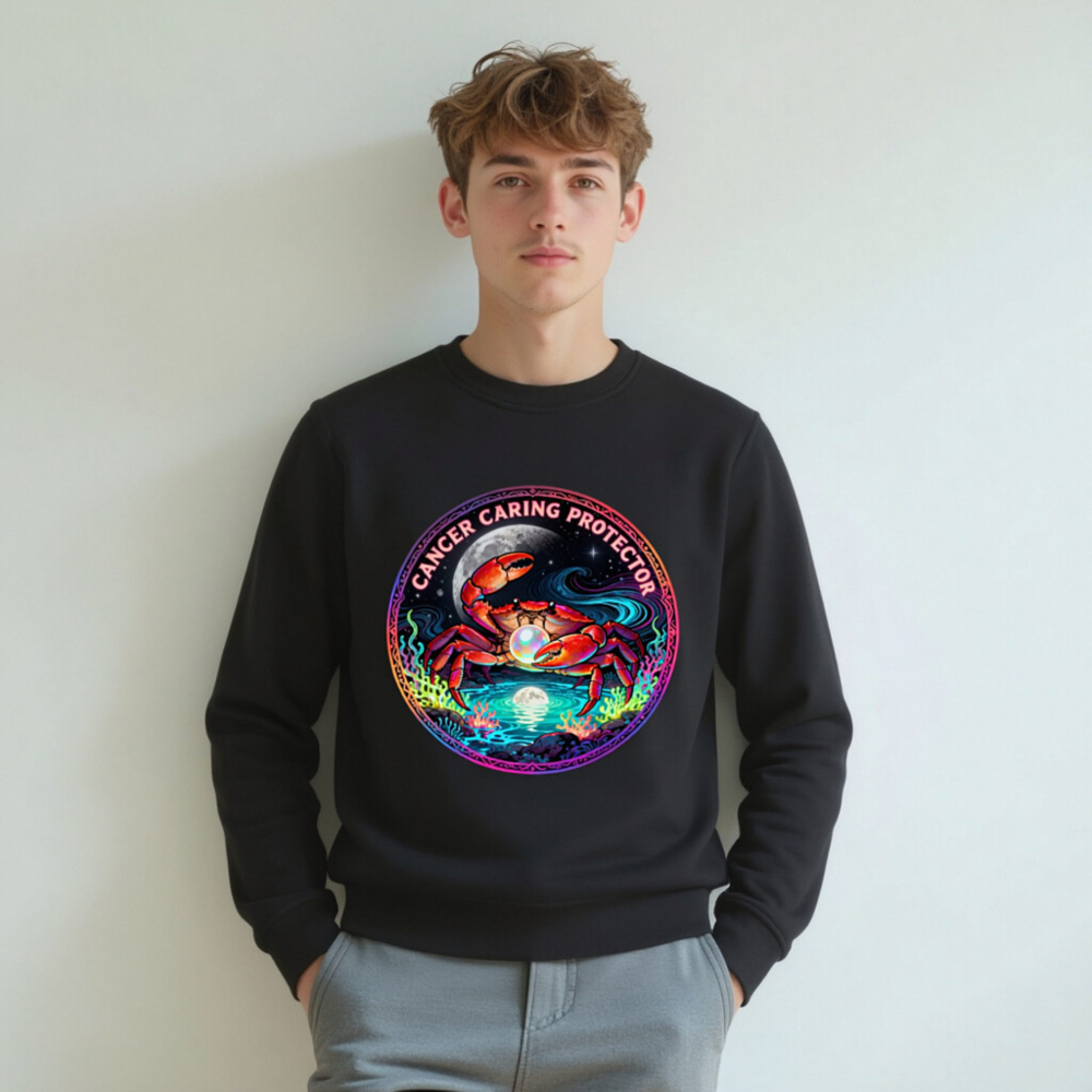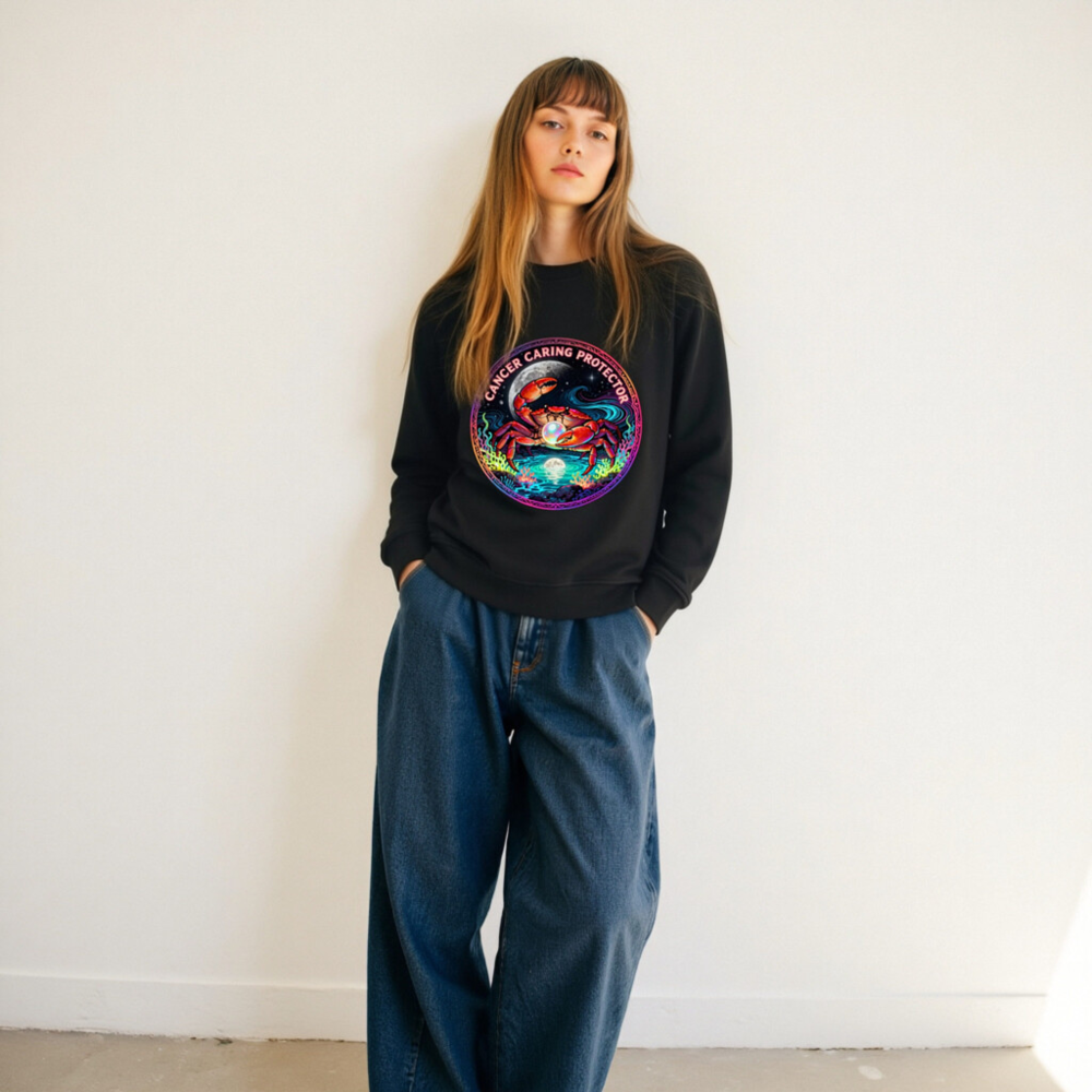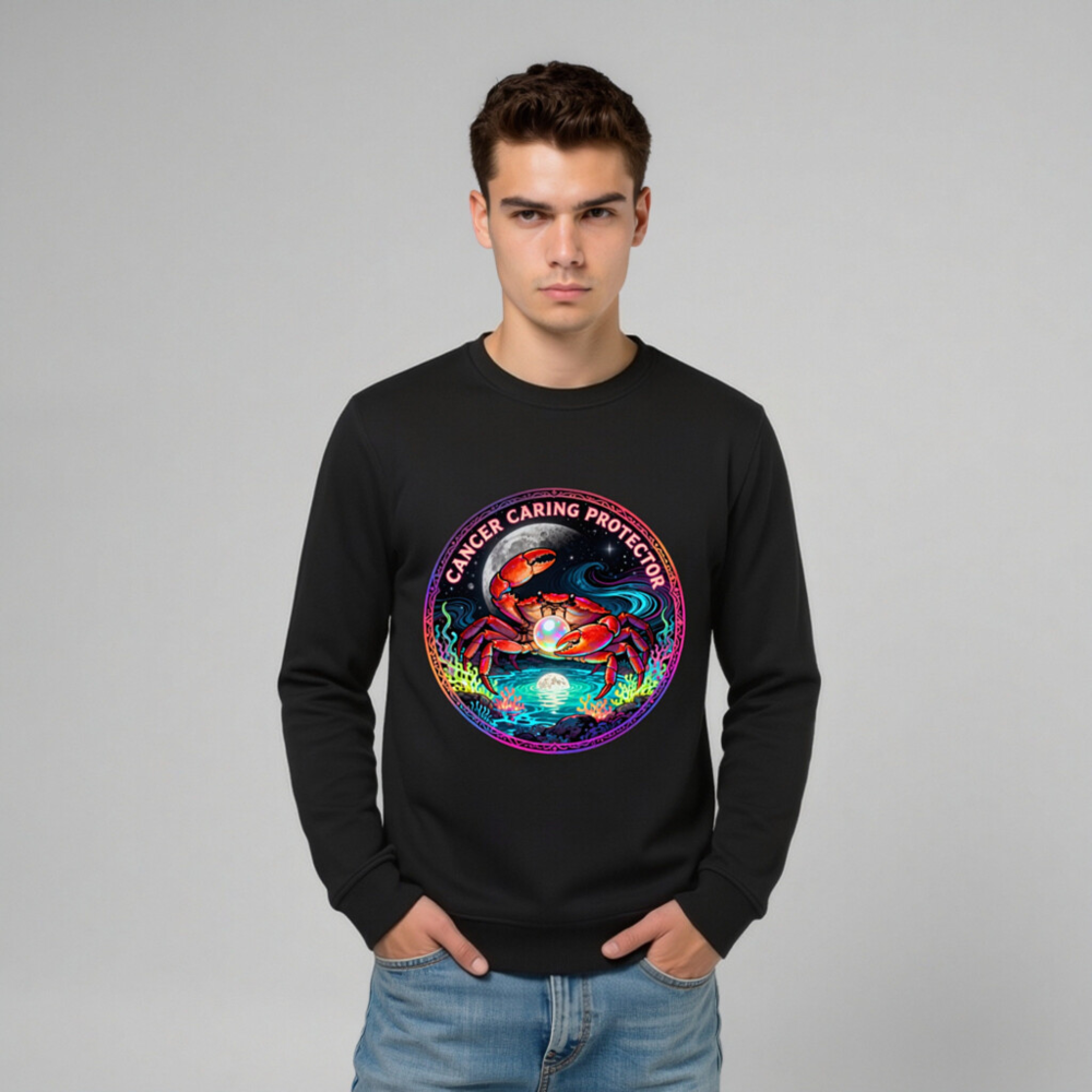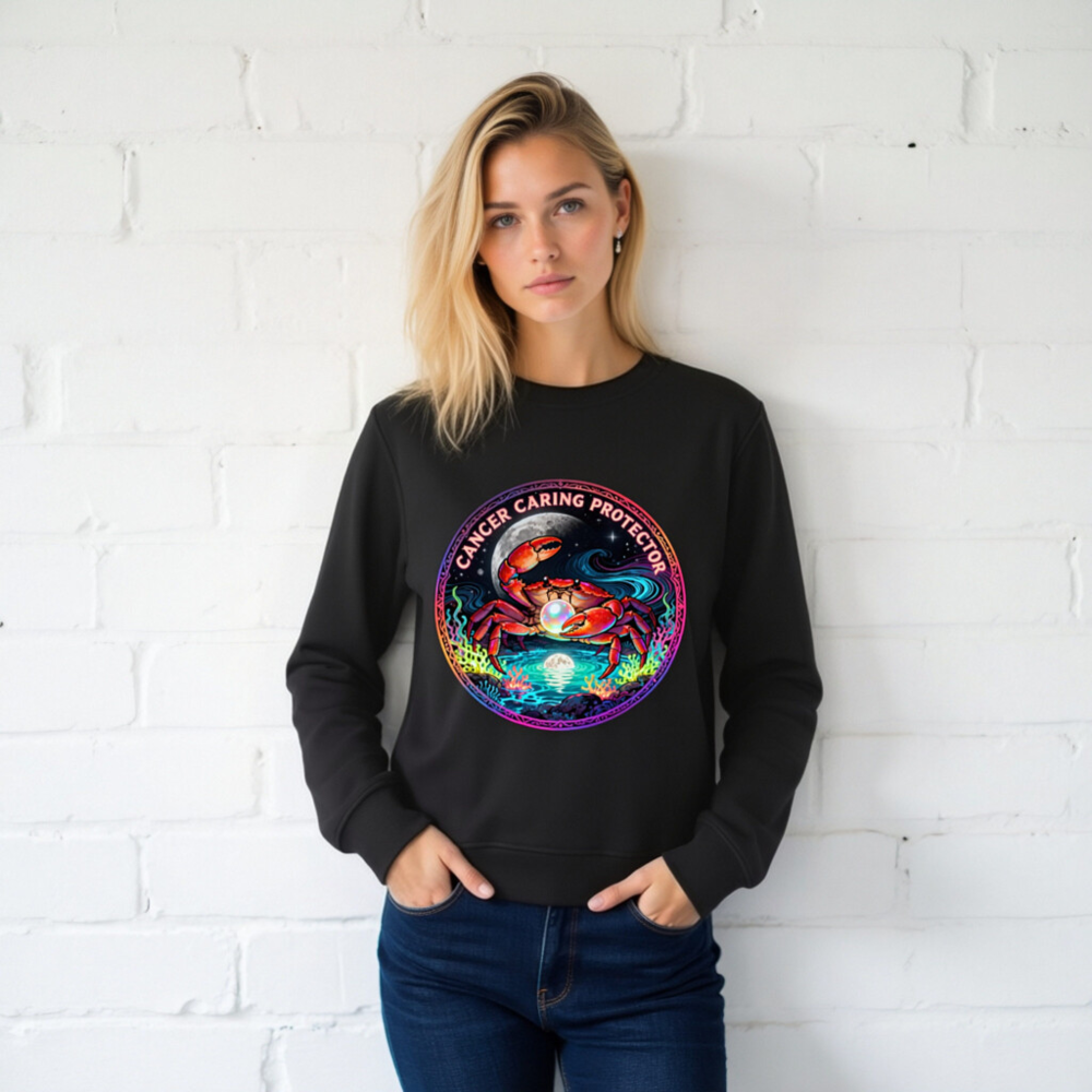 Wear the Cancer zodiac symbol with pride: this unisex organic sweatshirt features a vibrant, cosmic crab holding a pearl under moonlight—symbolizing care, protection, and intuition. Made from certified organic cotton, it’s soft, sustainable, and designed for comfort. The bold ‘Cancer Caring Protector’ text wraps the artwork, blending astrology, art, and eco-conscious style. Ideal for zodiac lovers seeking meaningful, ethical apparel.