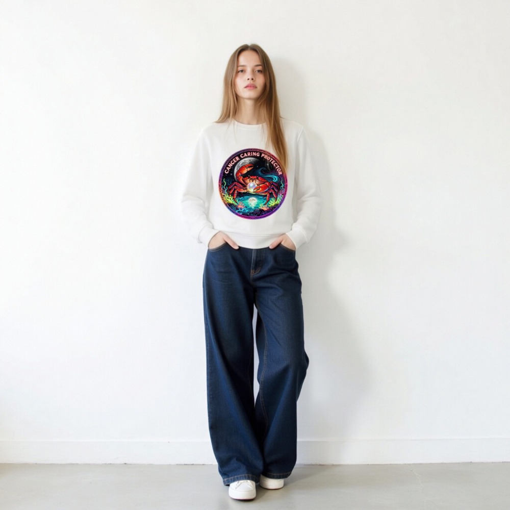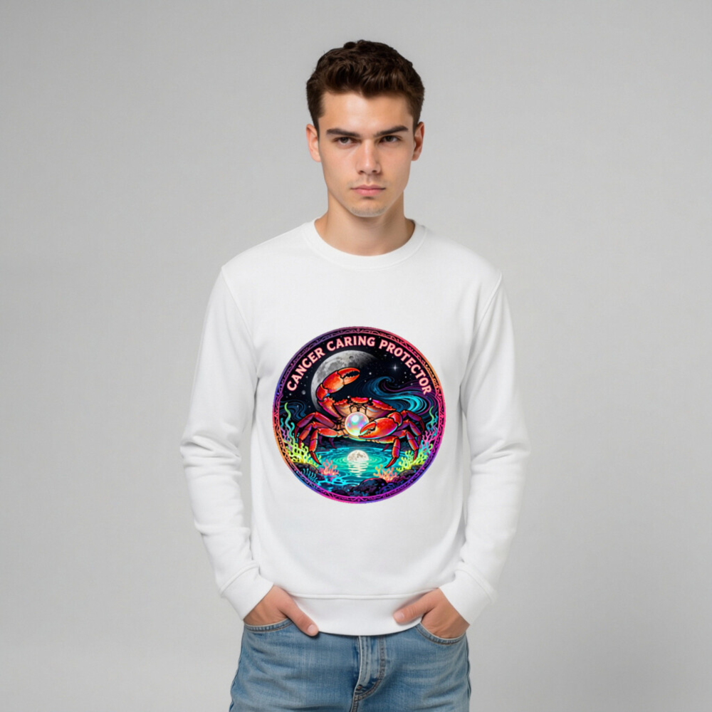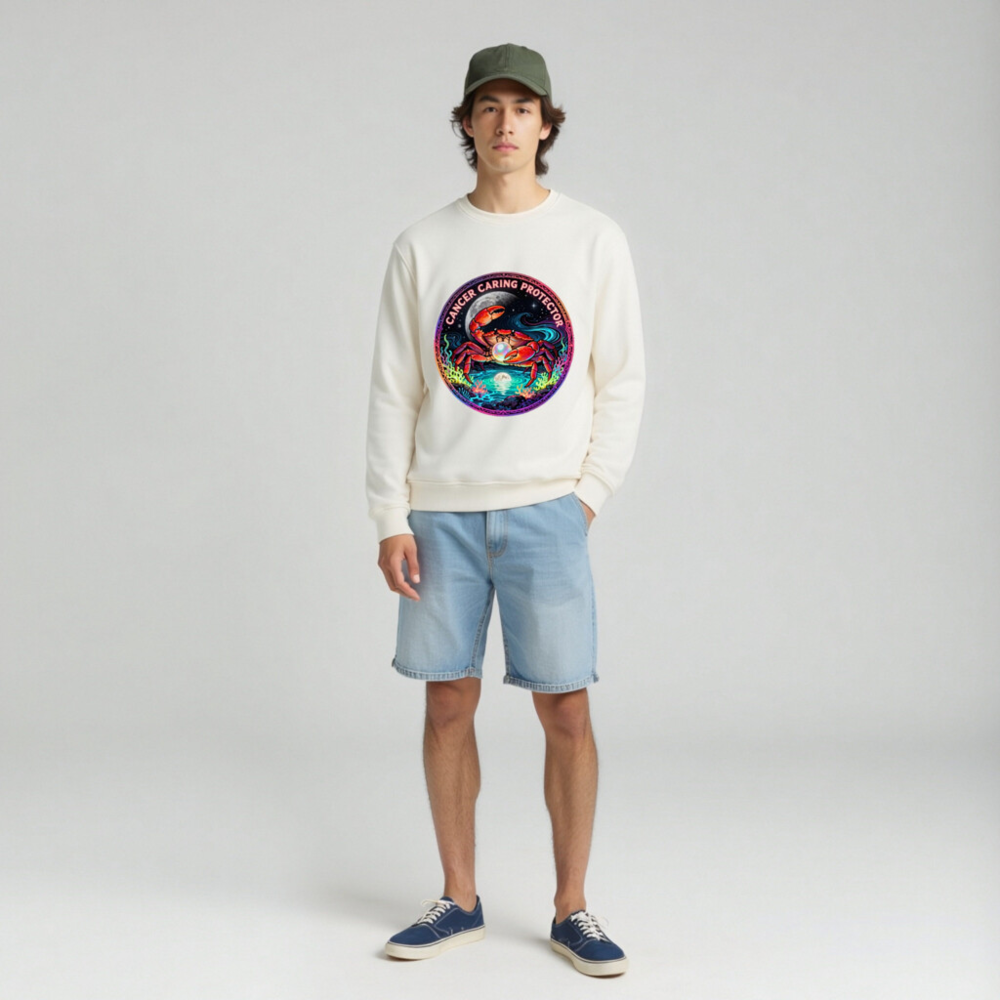 Wear the Cancer Caring Protector design: a vibrant, cosmic crab holding a pearl under moonlight, surrounded by neon coral and ocean waves. This unisex organic sweatshirt features soft, eco-friendly fabric with ethical production. Perfect for astrology lovers, cancer supporters, or anyone seeking meaningful, artistic apparel. Sustainable style with symbolic meaning—crafted for comfort and purpose.