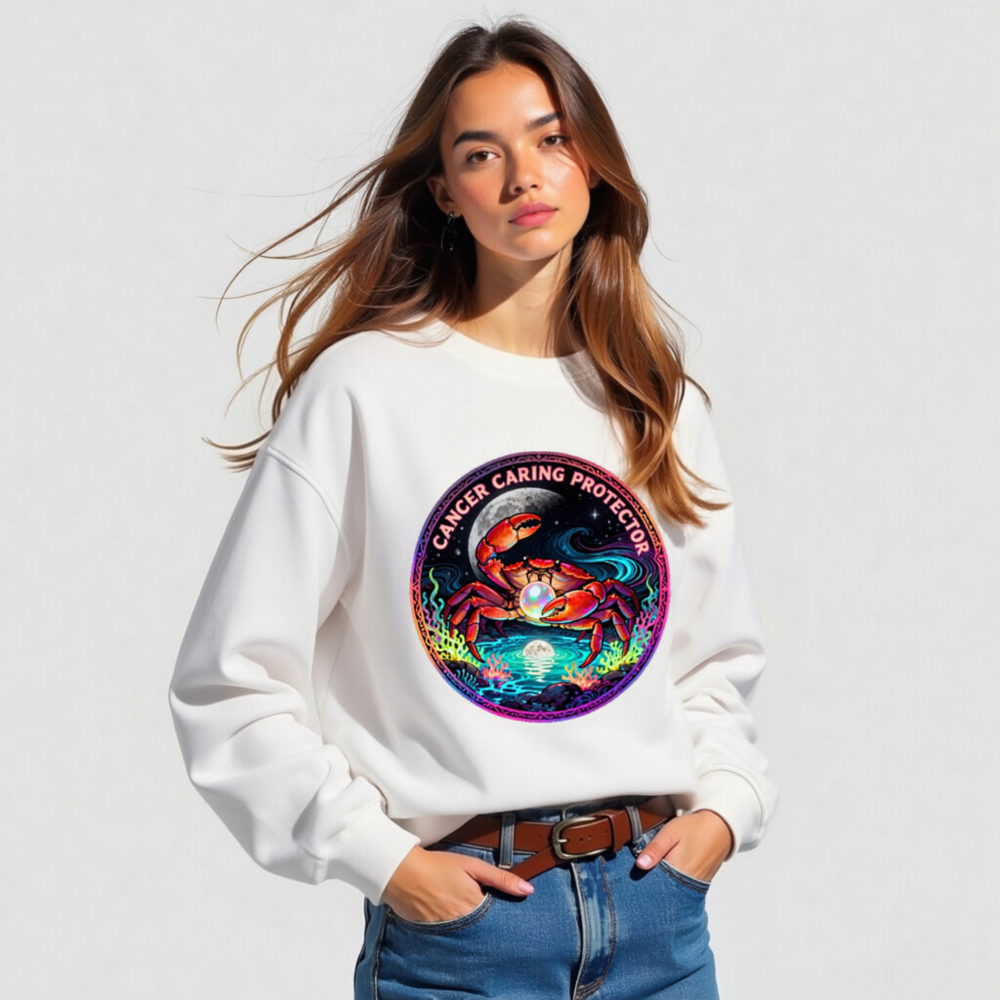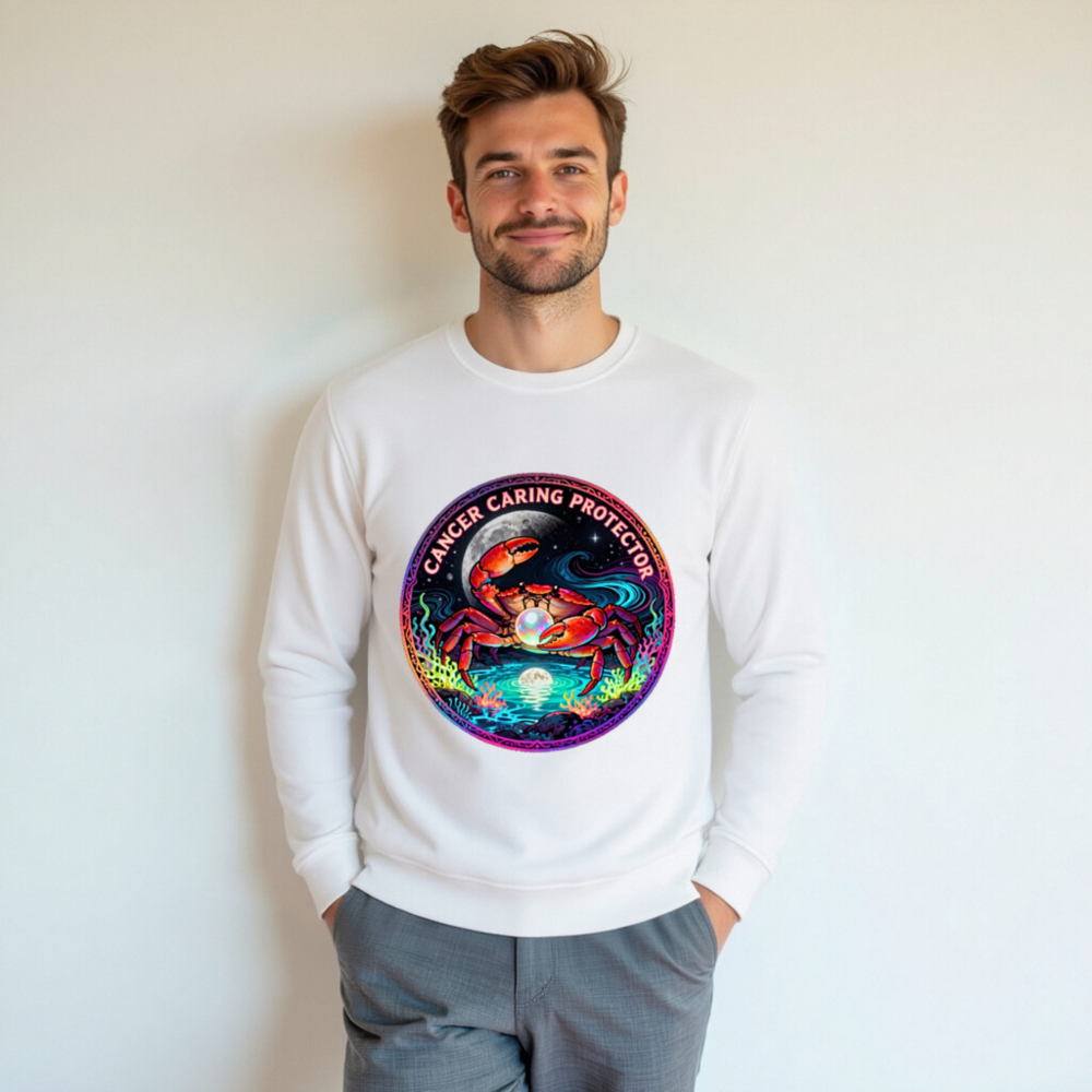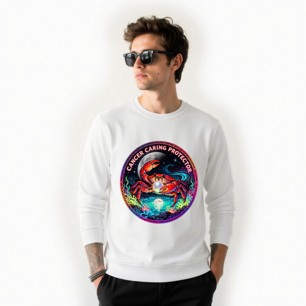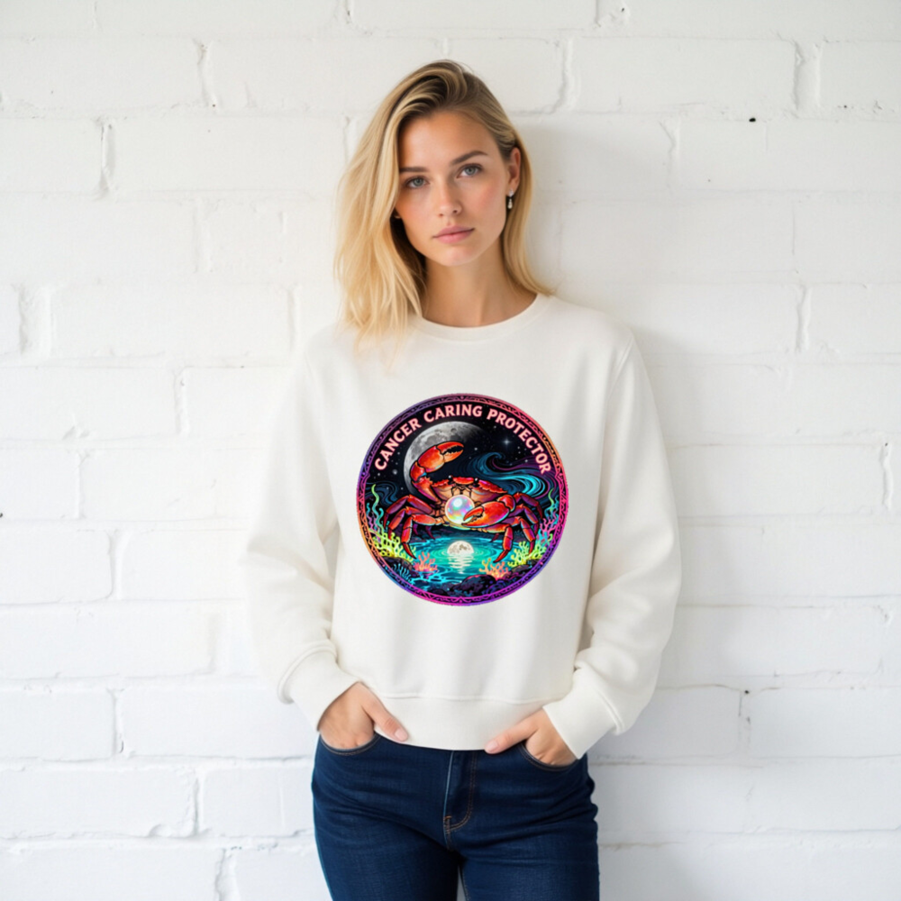 Wear the Cancer Caring Protector design: a vibrant, cosmic crab holding a pearl under moonlight, surrounded by neon coral and ocean waves. This unisex organic sweatshirt features soft, eco-friendly fabric with ethical production. Perfect for astrology lovers, cancer supporters, or anyone seeking meaningful, artistic apparel. Sustainable style with symbolic meaning—crafted for comfort and purpose.