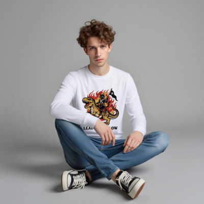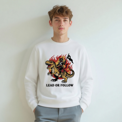 Eco-friendly unisex organic sweatshirt featuring bold vintage-style art: a black cat in military regalia riding a roaring T-Rex amid flames, holding a black flag with white cross. Printed with non-toxic ink on certified organic cotton. ‘Lead or Follow’ slogan below. Soft, sustainable, and statement-making—perfect for bold, eco-conscious wearers.