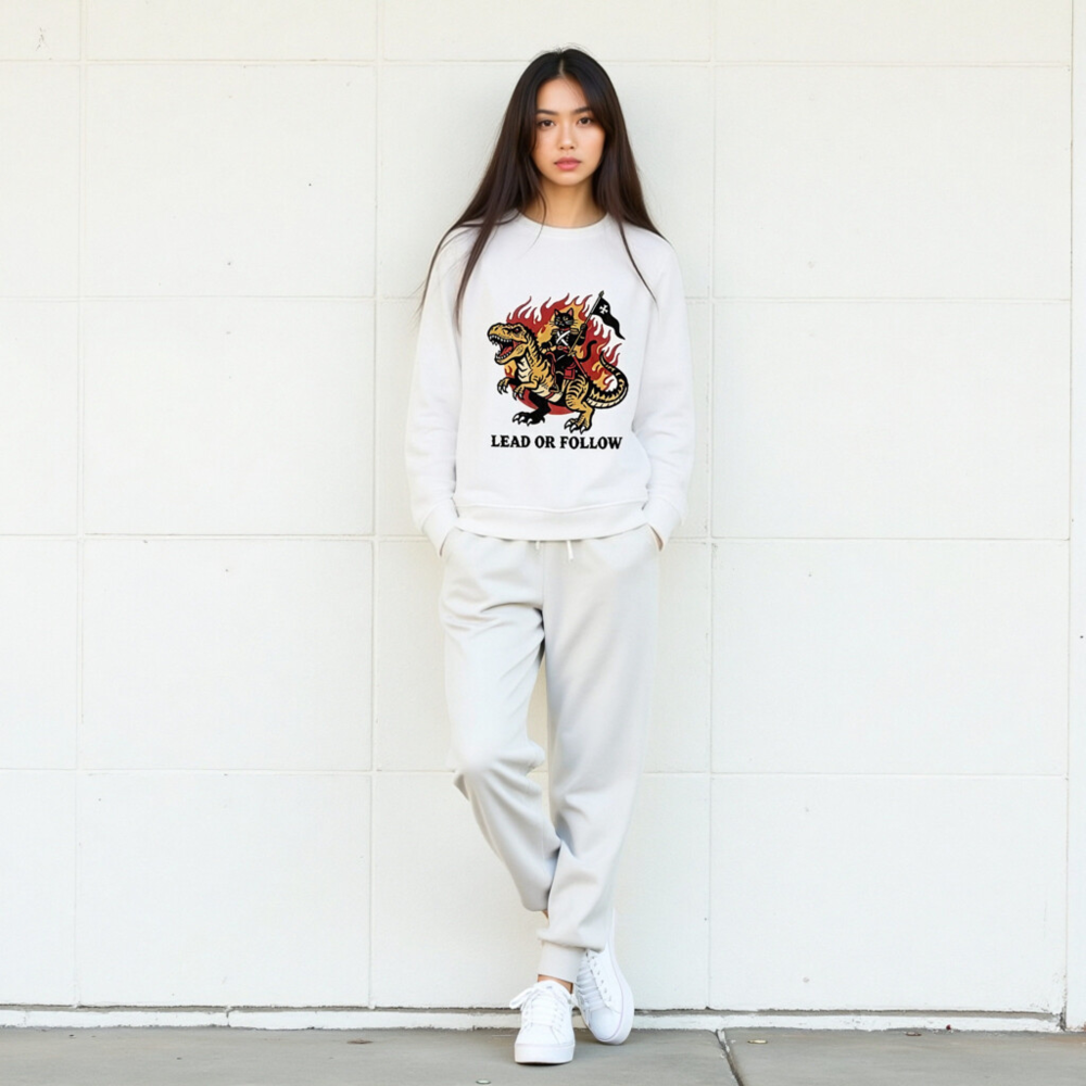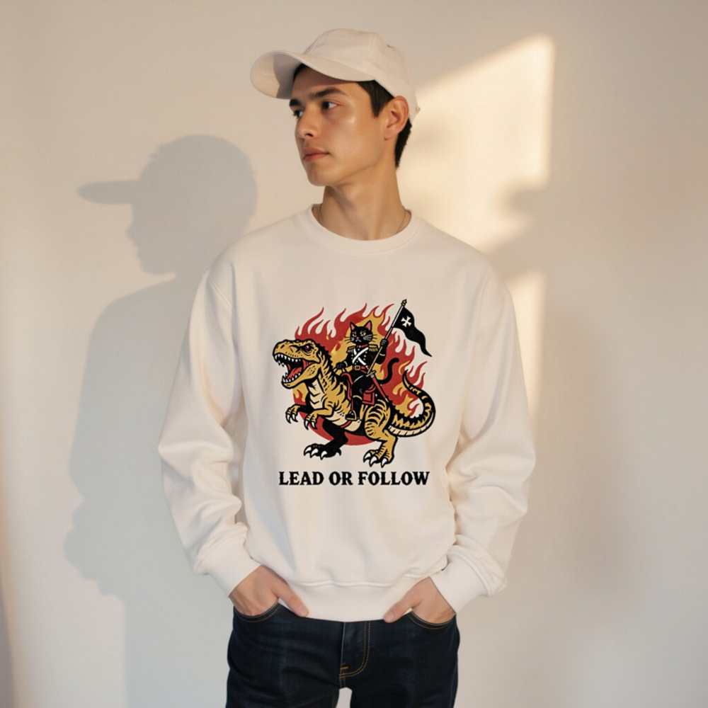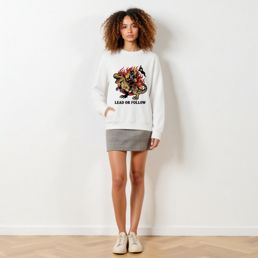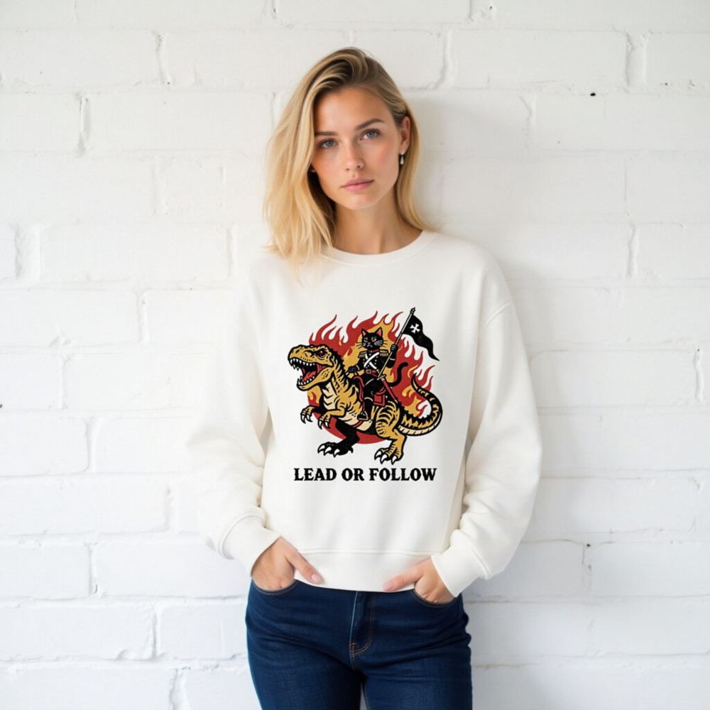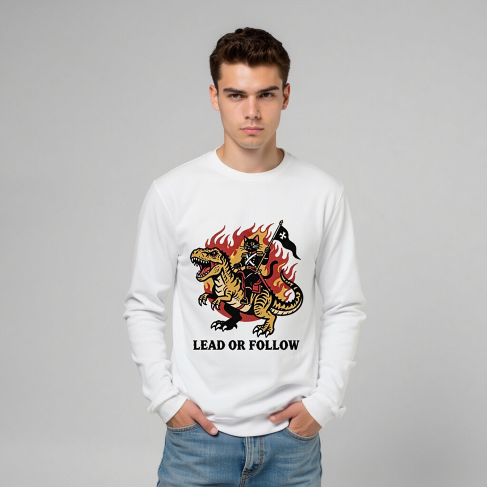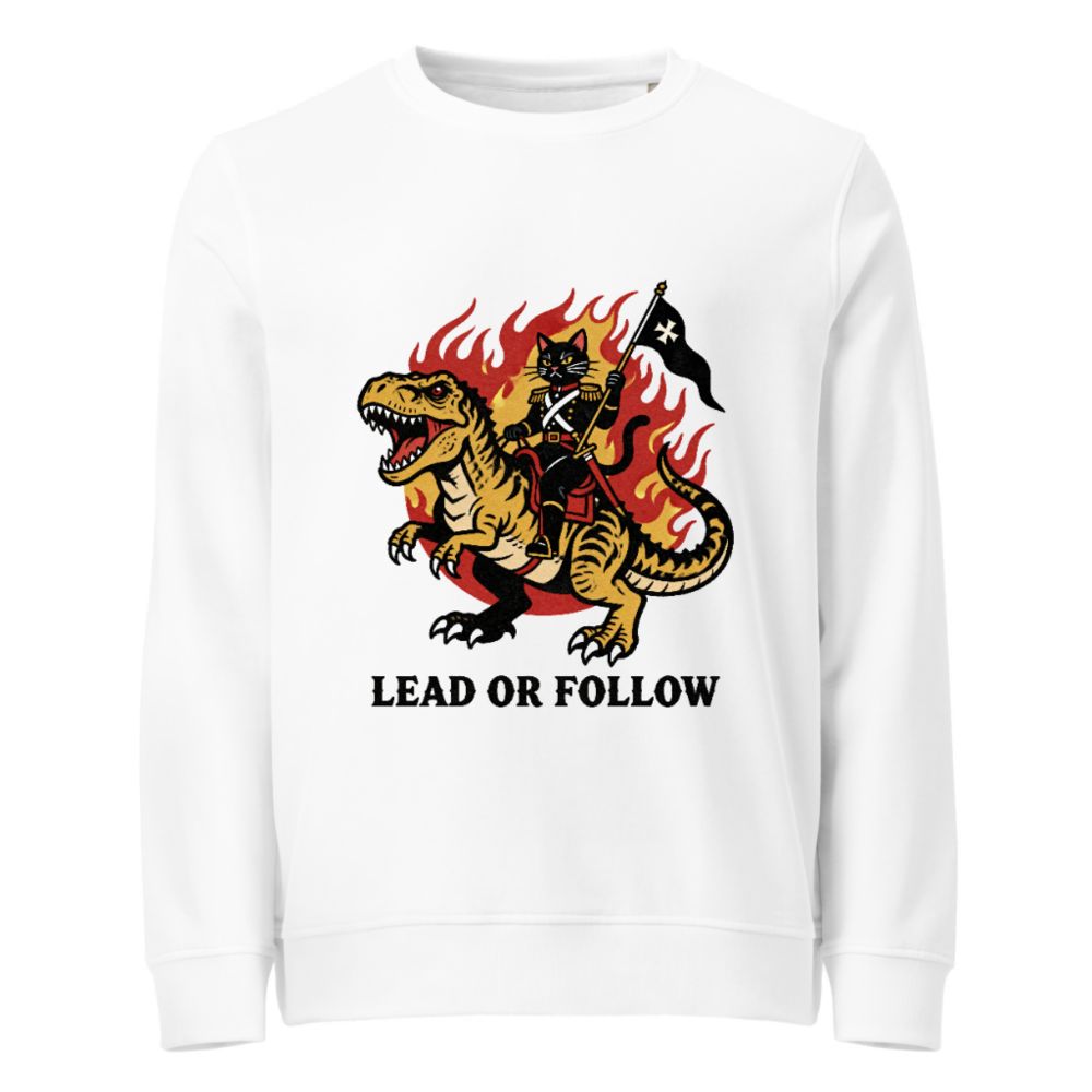 Eco-friendly unisex organic sweatshirt featuring bold vintage-style art: a black cat in military regalia riding a roaring T-Rex amid flames, holding a black flag with white cross. Printed with non-toxic ink on certified organic cotton. ‘Lead or Follow’ slogan below. Soft, sustainable, and statement-making—perfect for bold, eco-conscious wearers.