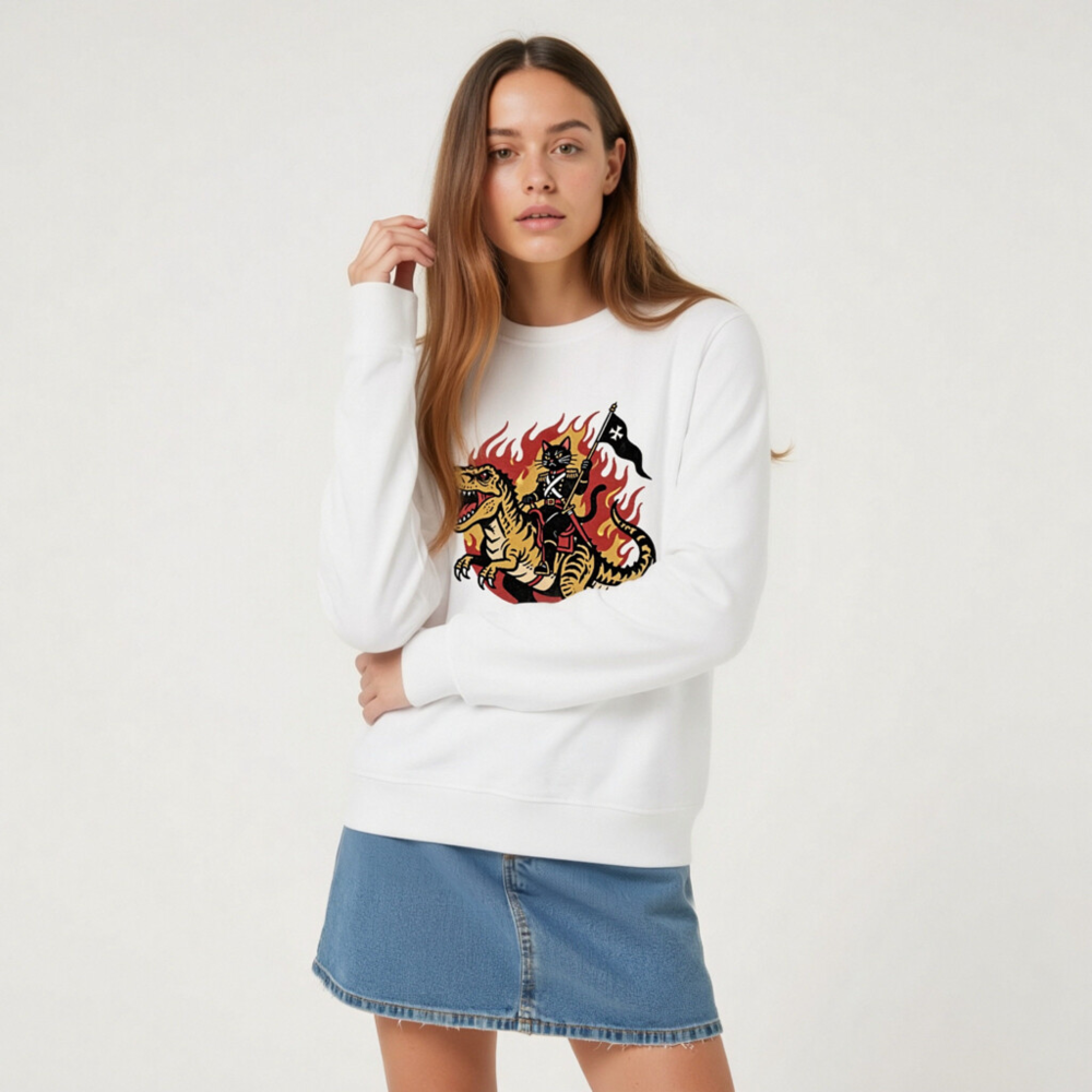 Unisex Organic Sweatshirt | Cat on T-Rex with Flame & Flag | Lead or Follow
