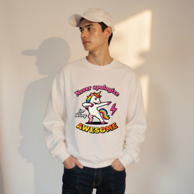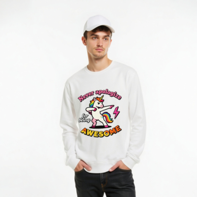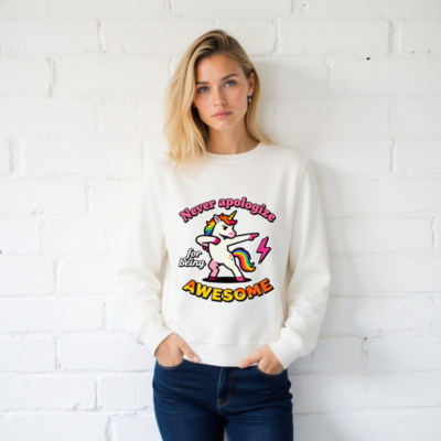 Eco-friendly unisex organic sweatshirt featuring a vibrant dabbing unicorn with rainbow mane/tail and bold ‘Never apologize for being AWESOME’ slogan. Soft, sustainable cotton blend, perfect for casual wear. Ideal gift for unicorn lovers & positivity enthusiasts. Fair trade certified, GOTS certified, 100% organic cotton. Size inclusive, machine washable.