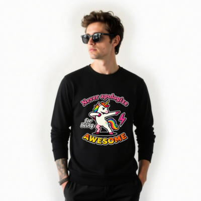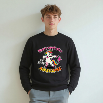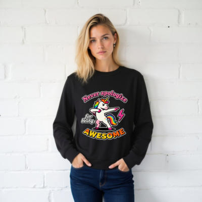 Wear confidence with this unisex organic sweatshirt featuring a vibrant dabbing unicorn design and the bold message ‘Never apologize for being AWESOME’. Made from certified organic cotton, it’s soft, sustainable, and perfect for everyday comfort. The playful, colorful graphic adds fun to any outfit—ideal for self-expression and eco-conscious style.