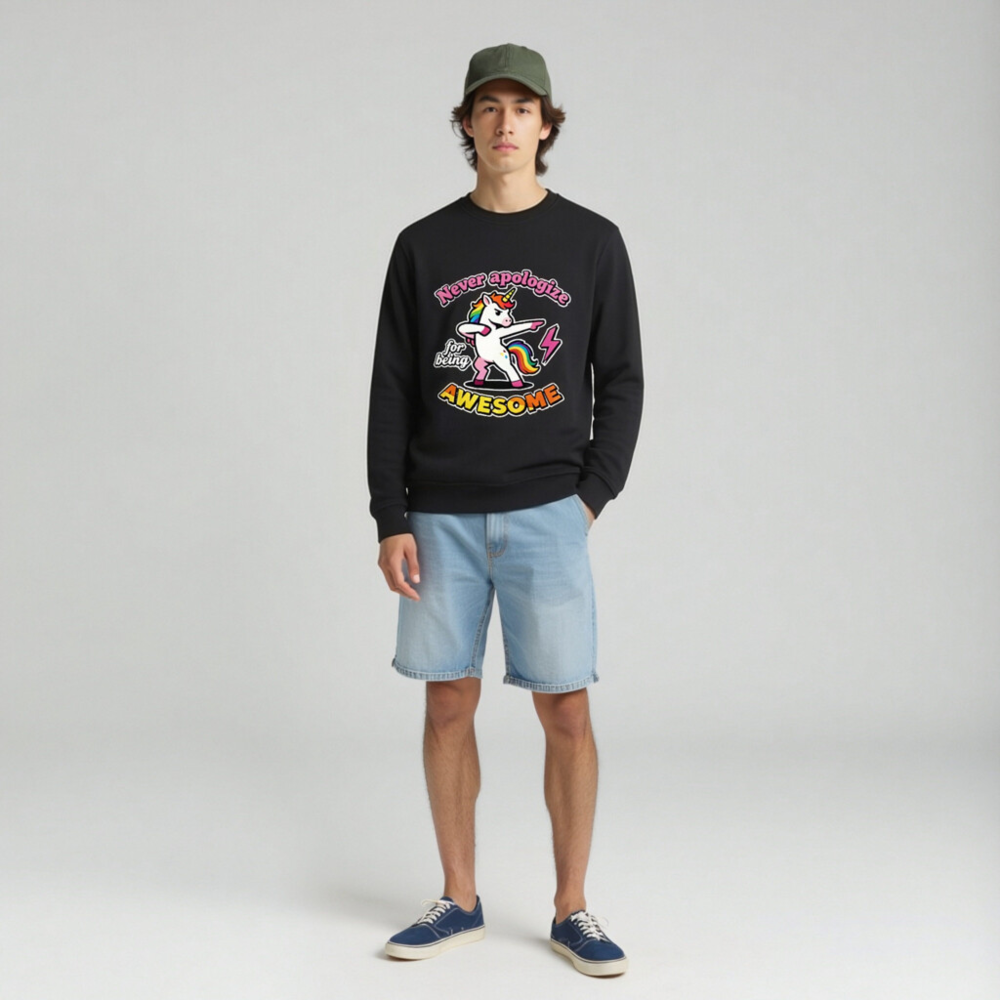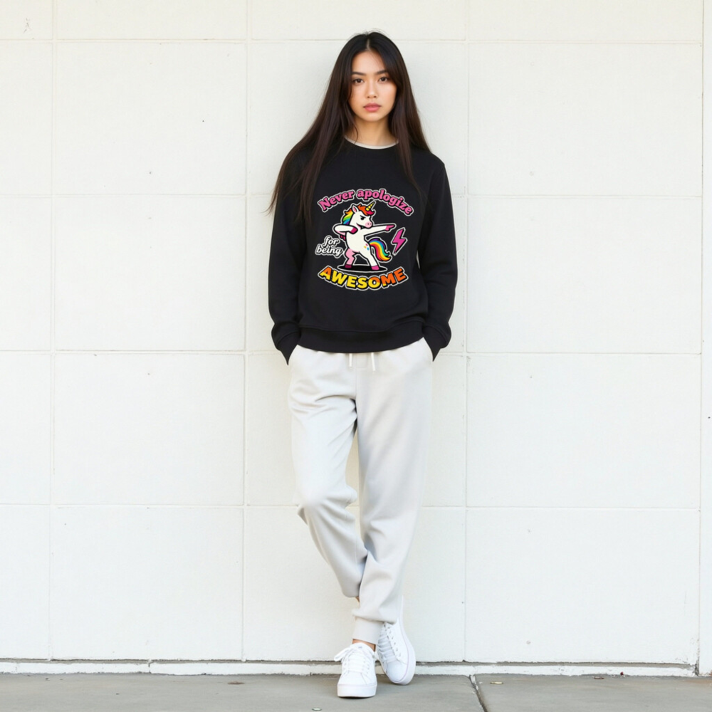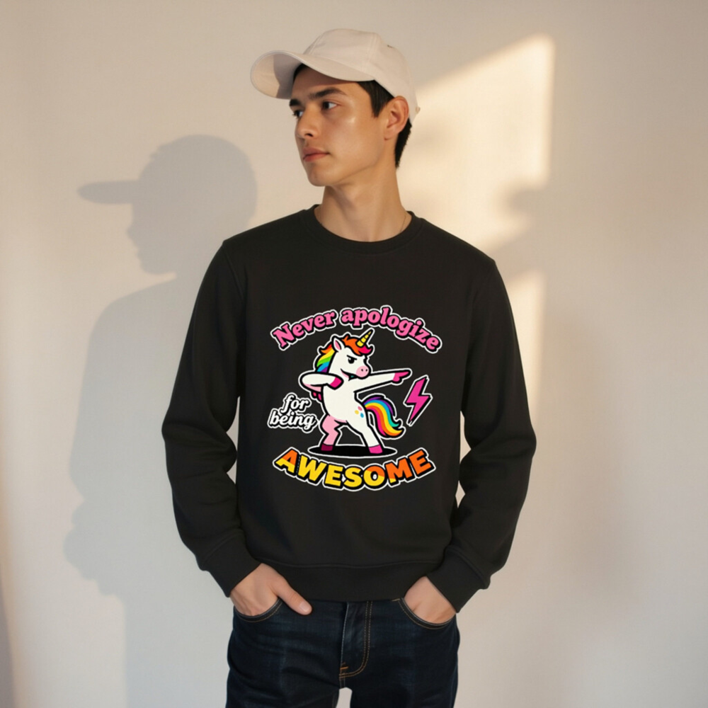 Wear confidence with this unisex organic sweatshirt featuring a vibrant dabbing unicorn design and the bold message ‘Never apologize for being AWESOME’. Made from certified organic cotton, it’s soft, sustainable, and perfect for everyday comfort. The playful, colorful graphic adds fun to any outfit—ideal for self-expression and eco-conscious style.