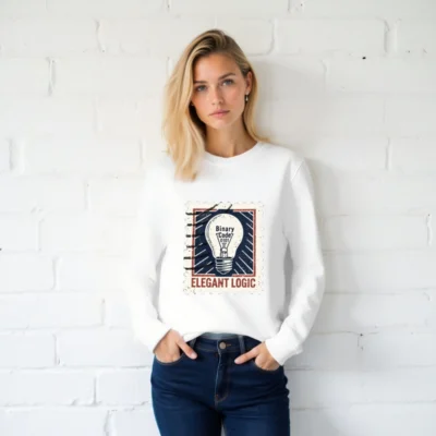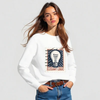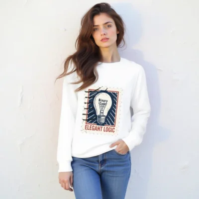 Elegant Logic Unisex Organic Sweatshirt — a sustainable, comfortable crewneck featuring a vintage stamp-style light bulb graphic with ‘Binary Code 0101’ and bold ‘ELEGANT LOGIC’ text. Made from certified organic cotton for eco-conscious wearers. Ideal for tech lovers, designers, and minimalist fashion fans seeking ethical style.