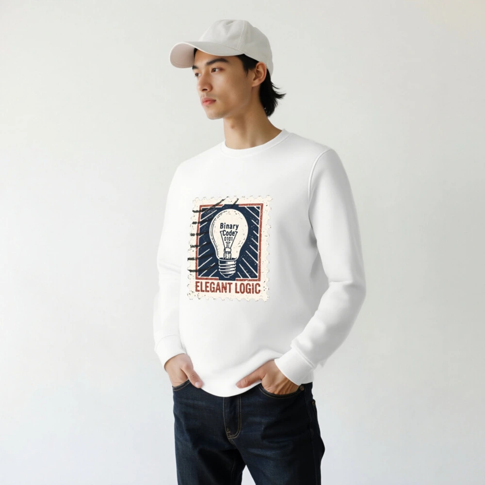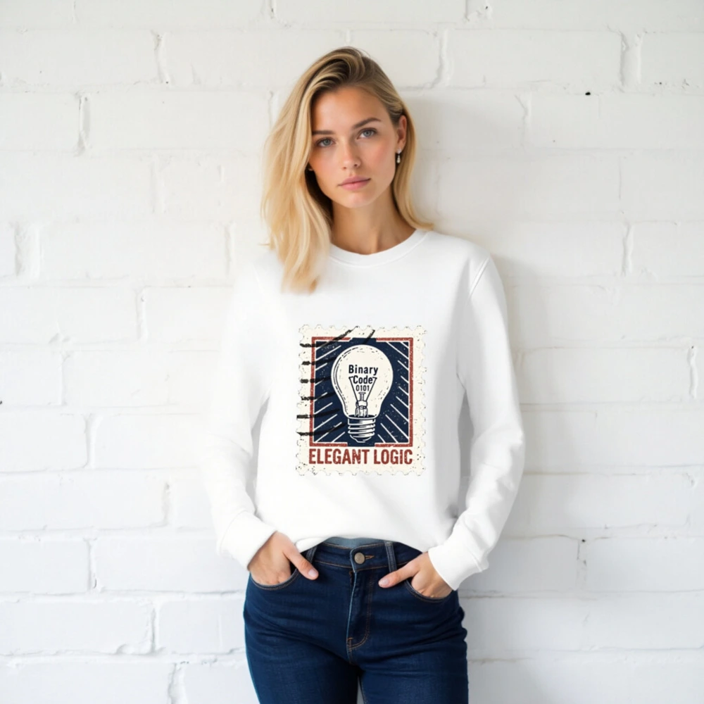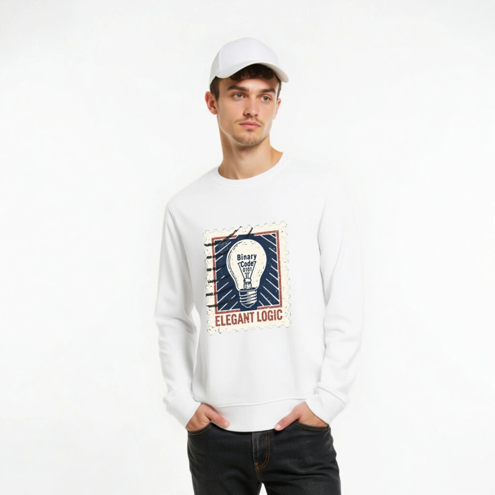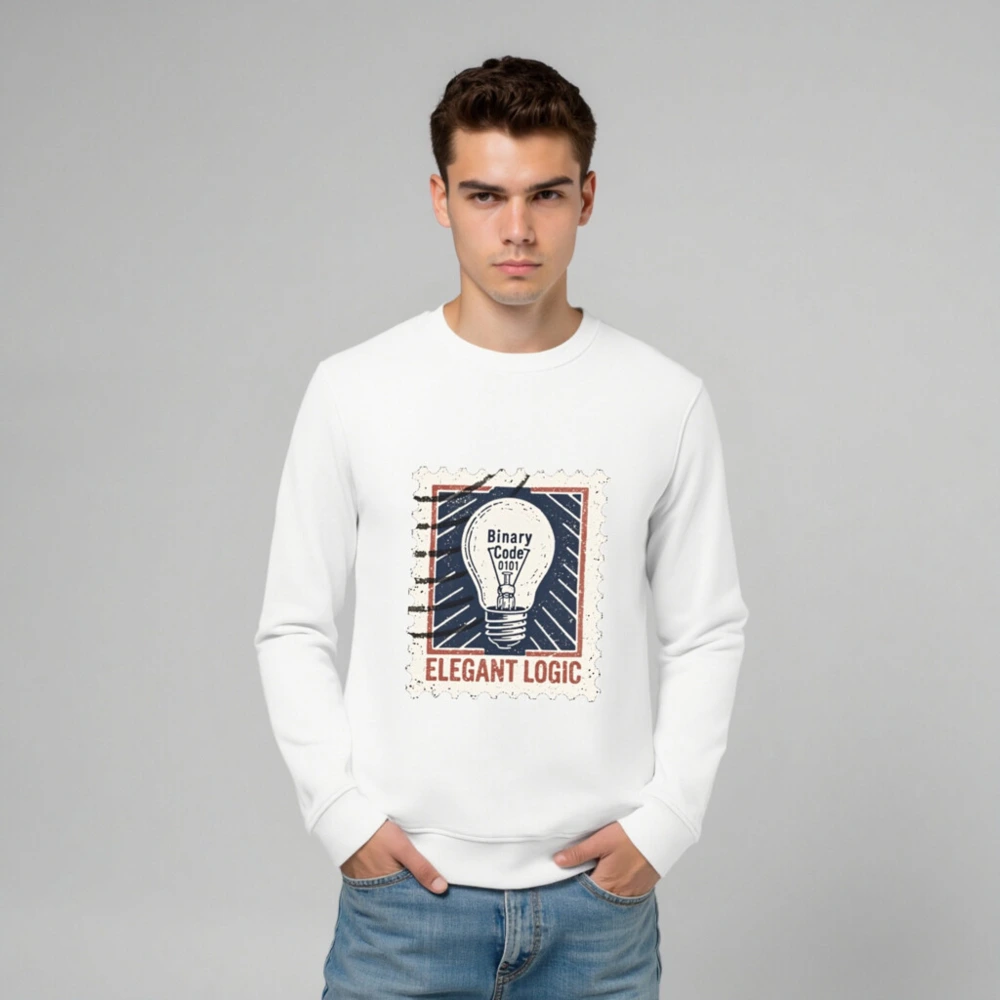 Elegant Logic Unisex Organic Sweatshirt — a sustainable, comfortable crewneck featuring a vintage stamp-style light bulb graphic with ‘Binary Code 0101’ and bold ‘ELEGANT LOGIC’ text. Made from certified organic cotton for eco-conscious wearers. Ideal for tech lovers, designers, and minimalist fashion fans seeking ethical style.