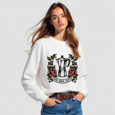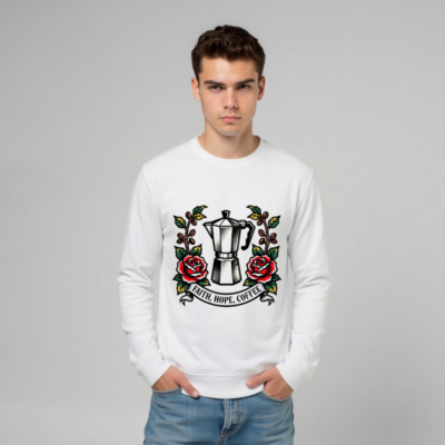 This unisex organic sweatshirt features a vibrant vintage tattoo-style design with a classic Moka pot flanked by red roses and coffee beans. The bold banner reads ‘FAITH, HOPE, COFFEE’—perfect for coffee lovers who value sustainability. Made from certified organic cotton, it’s soft, eco-friendly, and designed for everyday comfort. Ideal as a thoughtful gift or personal statement piece.
