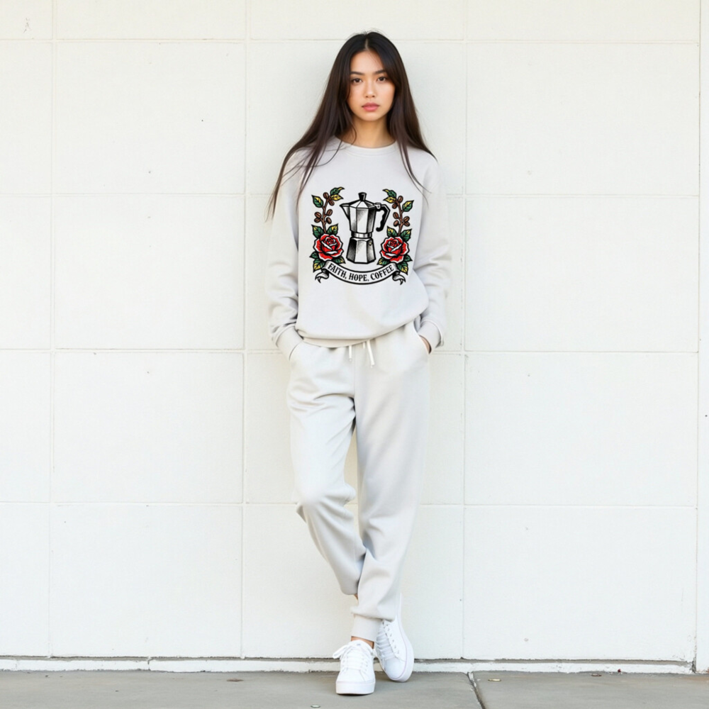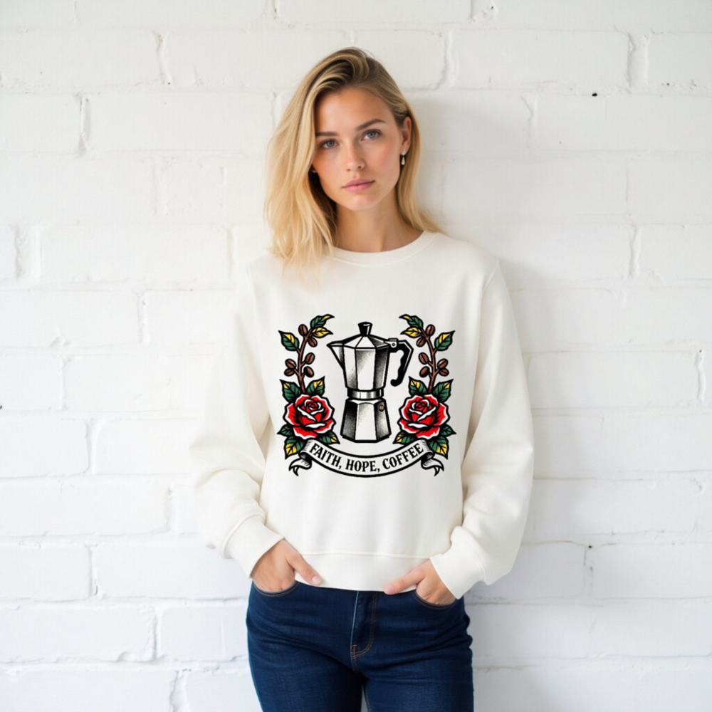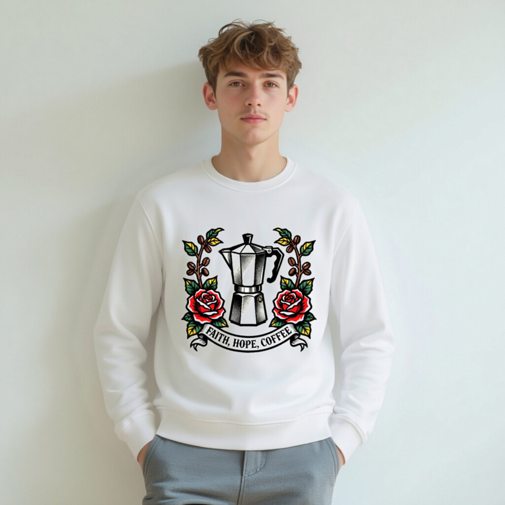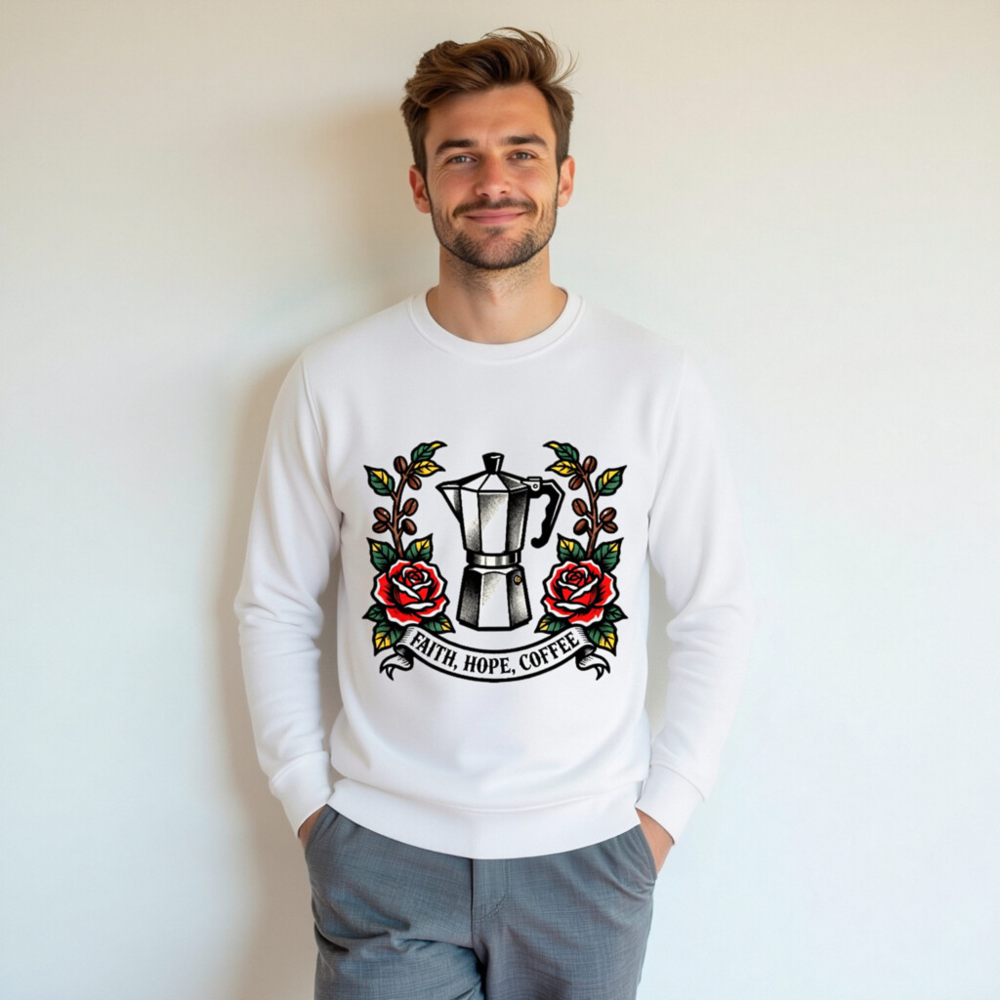 Unisex Organic Sweatshirt | Faith, Hope, Coffee Moka Pot Rose Tattoo Design
