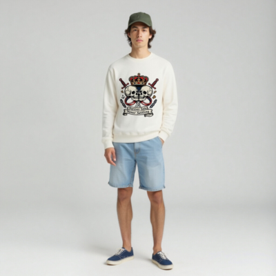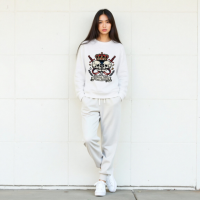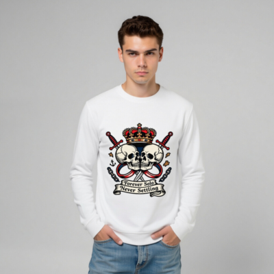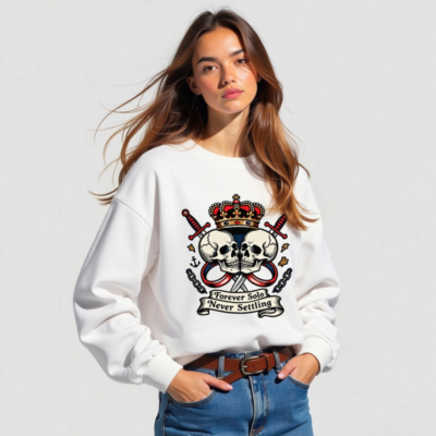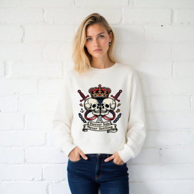 Show your bold spirit with this unisex organic sweatshirt featuring a striking vintage-style design: two skulls, crossed swords, a royal crown, anchor, and chains. The ‘Forever Solo Never Settling’ banner adds rebellious flair. Made from certified organic cotton for comfort and sustainability. Ideal for everyday wear or statement style.