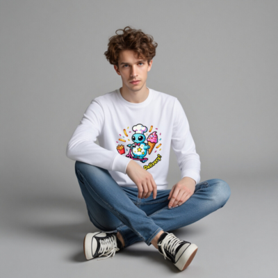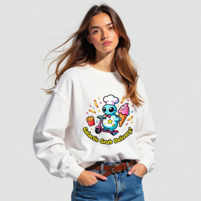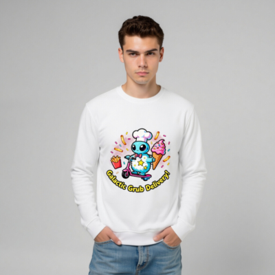 A playful unisex organic sweatshirt featuring a cute blue alien chef on a pink scooter, delivering fries and ice cream with sprinkles. Soft, eco-friendly fabric made from certified organic cotton. Perfect for cosmic food lovers—fun, comfortable, and sustainably crafted. Ideal for casual wear or as a unique gift.