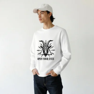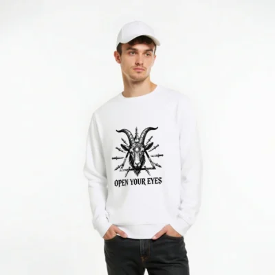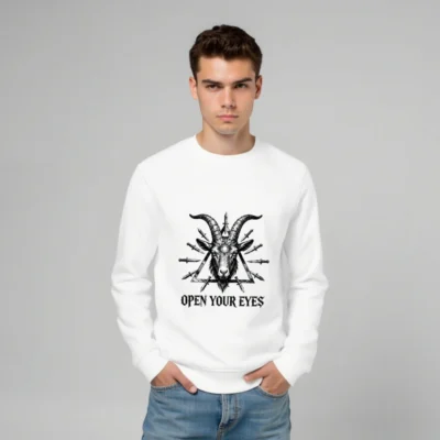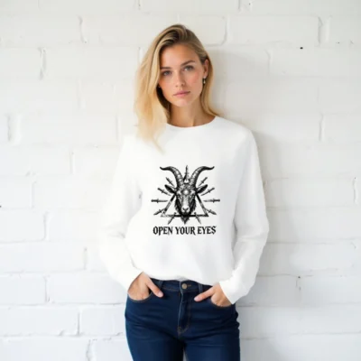 Wear the bold ‘Open Your Eyes’ message on this unisex organic sweatshirt, featuring a striking black-and-white goat head with third eye and surrounding knives inside a triangle. Made from certified organic cotton, it’s soft, sustainable, and designed for everyday wear. Ideal for those who appreciate symbolic art and ethical fashion. Comfortable fit, eco-conscious choice—no synthetic blends or harmful dyes.