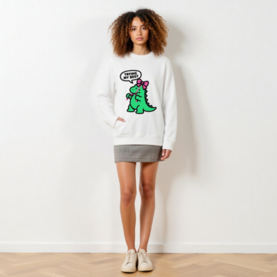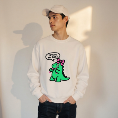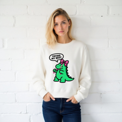 Unisex Organic Sweatshirt | Green Dino with Pink Bow, ‘Trying My Best’ – Eco-Friendly & Comfortable