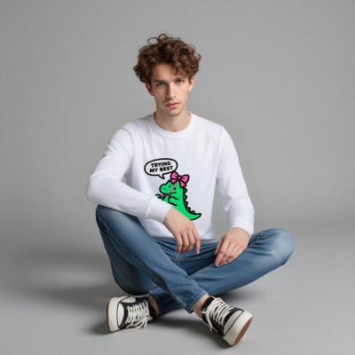 Show your best effort with this unisex organic sweatshirt featuring a cute green dino wearing a pink bow and the uplifting phrase ‘Trying My Best’. Made from certified organic cotton for soft comfort and sustainability. Ideal for everyday wear—eco-conscious, stylish, and inclusive for all. Perfect gift for positivity lovers.