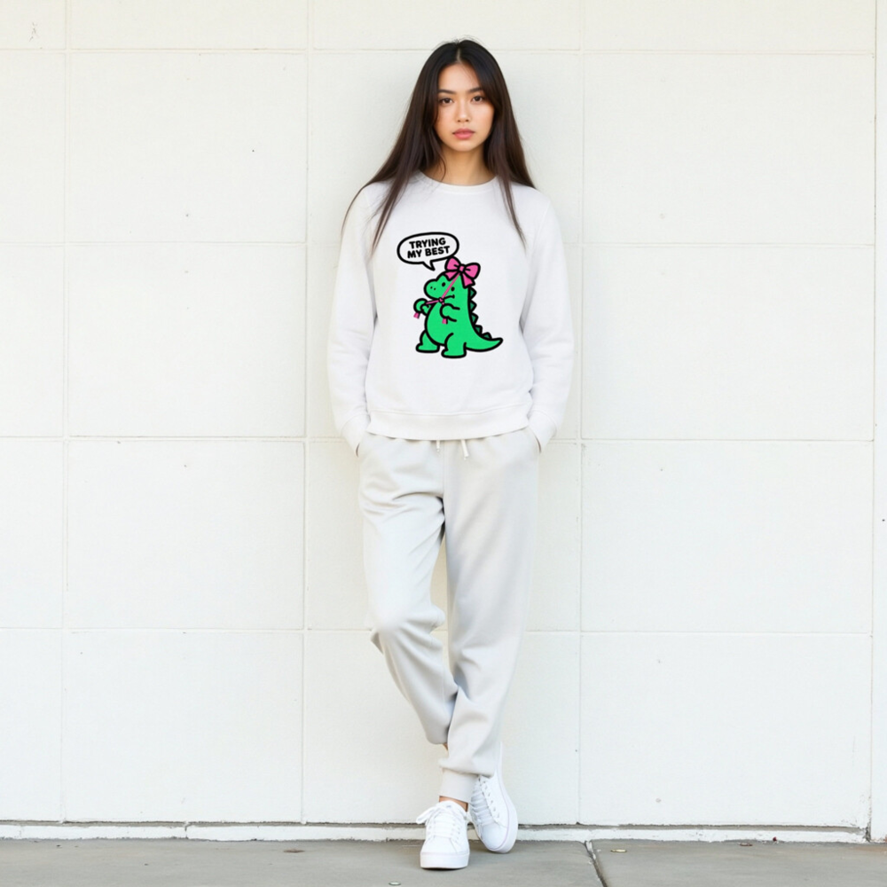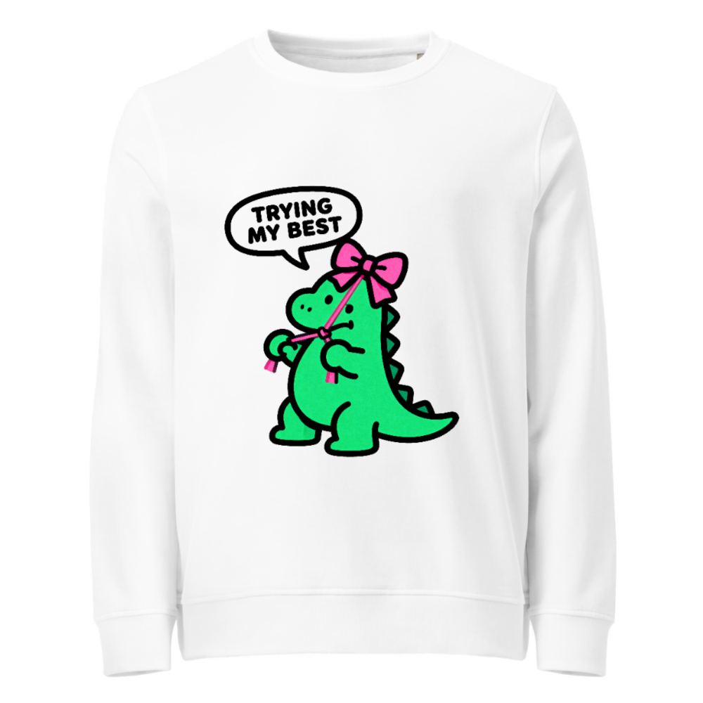 Unisex Organic Sweatshirt | Green Dino with Pink Bow, ‘Trying My Best’ – Eco-Friendly & Comfortable