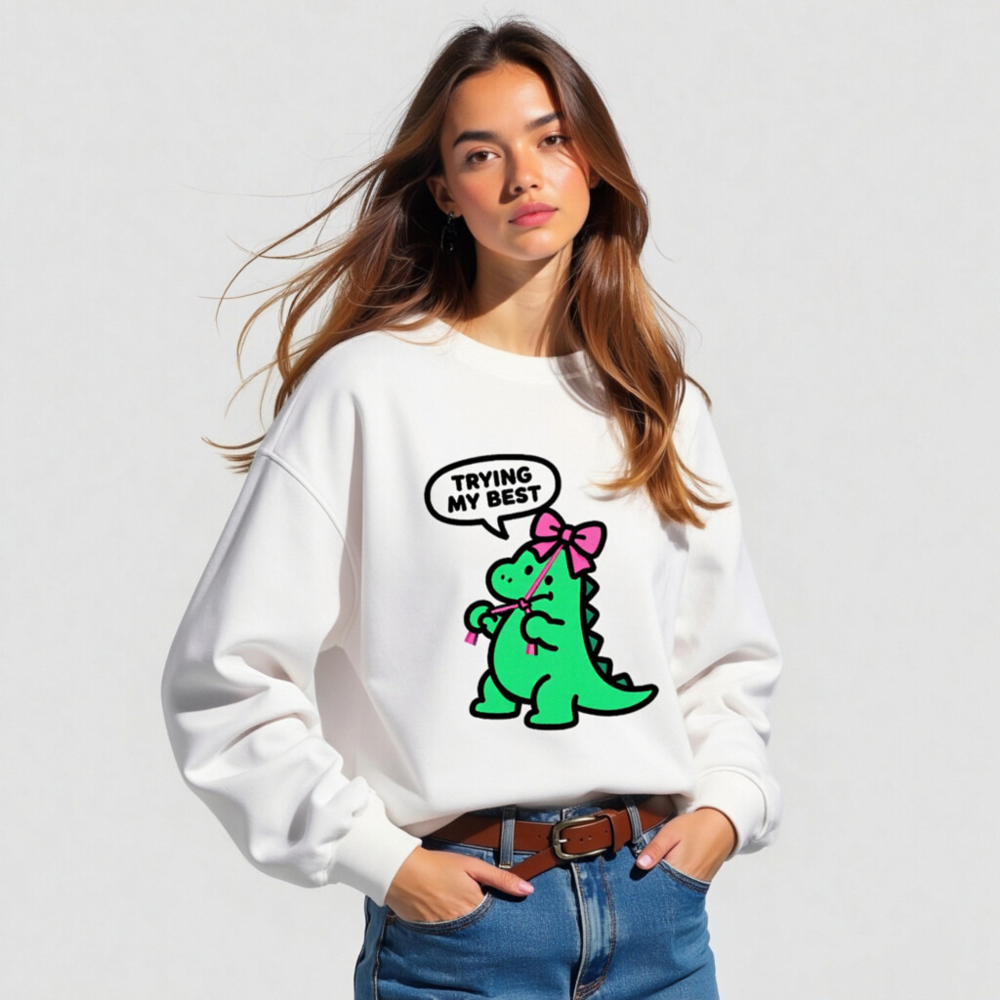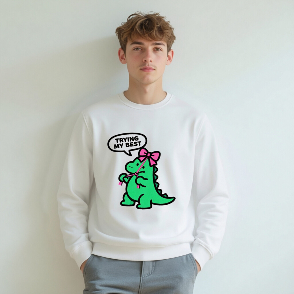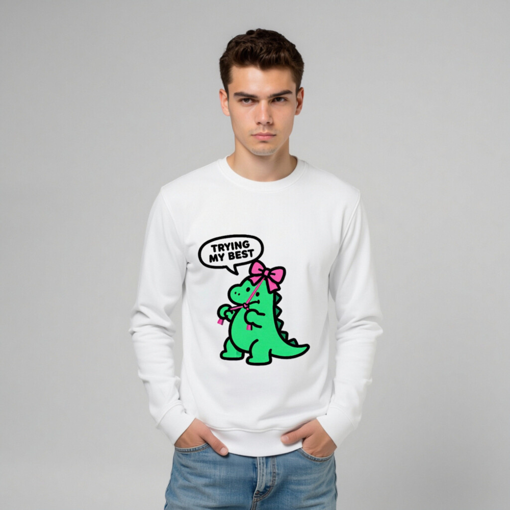 Show your best effort with this unisex organic sweatshirt featuring a cute green dino wearing a pink bow and the uplifting phrase ‘Trying My Best’. Made from certified organic cotton for soft comfort and sustainability. Ideal for everyday wear—eco-conscious, stylish, and inclusive for all. Perfect gift for positivity lovers.