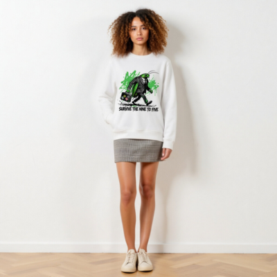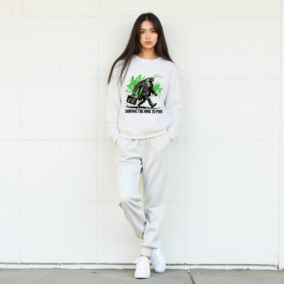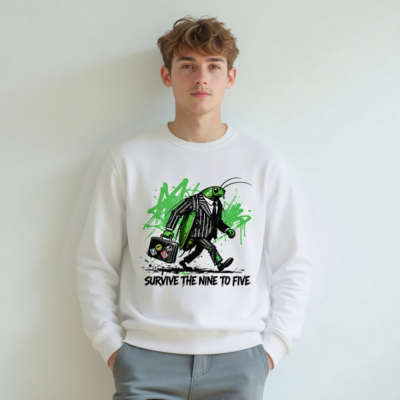 Wear sustainable style with this unisex organic sweatshirt featuring a bold graphic of a green grasshopper in a pinstripe suit, carrying a vintage briefcase adorned with stickers. The design humorously captures the ‘survive the nine to five’ theme against vibrant green splatter art. Made from certified organic cotton, it’s soft, eco-friendly, and perfect for everyday comfort. Ideal for professionals, creatives, or anyone who loves quirky, meaningful apparel.