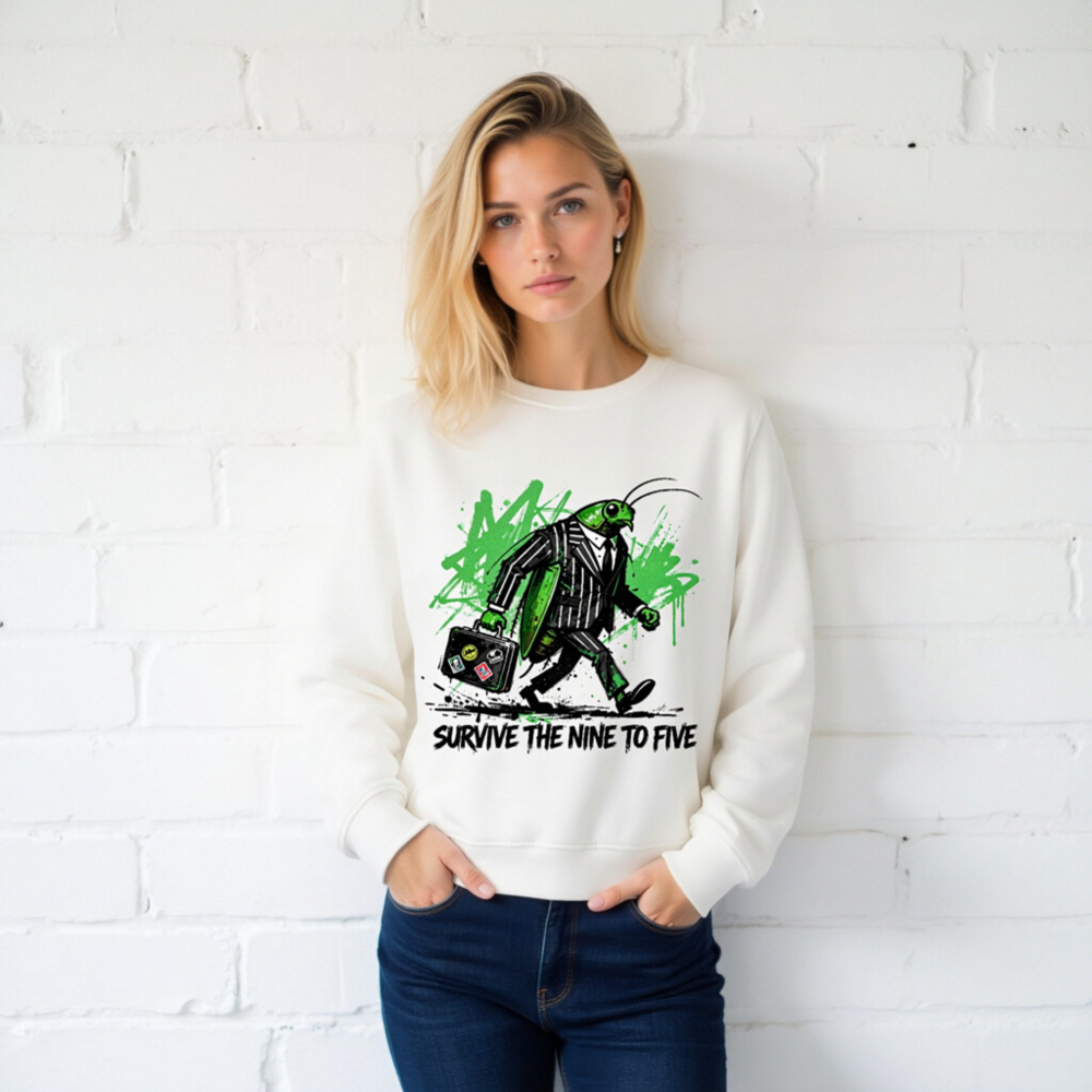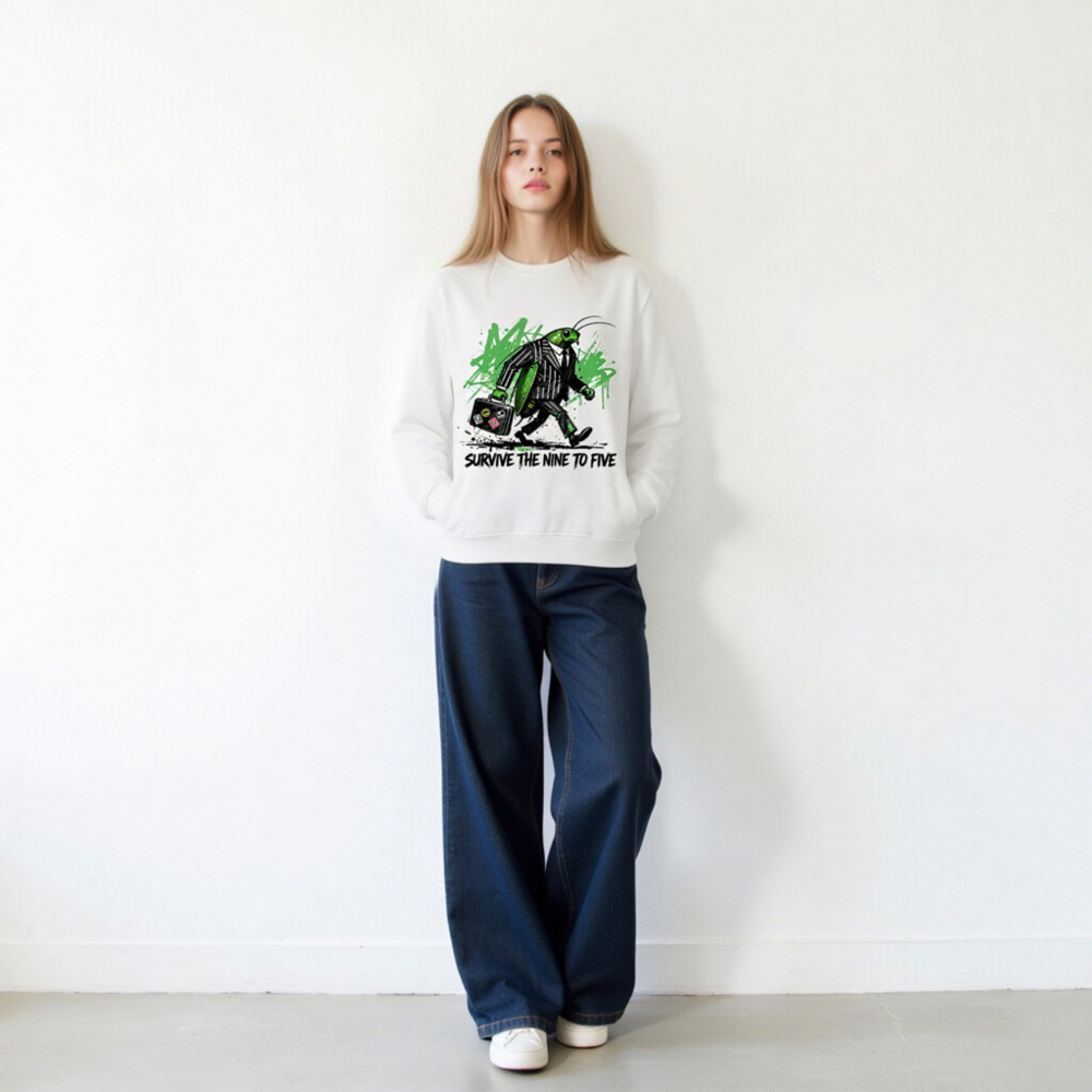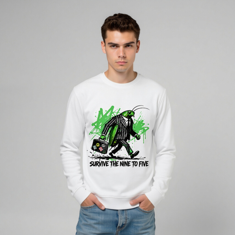 Wear sustainable style with this unisex organic sweatshirt featuring a bold graphic of a green grasshopper in a pinstripe suit, carrying a vintage briefcase adorned with stickers. The design humorously captures the ‘survive the nine to five’ theme against vibrant green splatter art. Made from certified organic cotton, it’s soft, eco-friendly, and perfect for everyday comfort. Ideal for professionals, creatives, or anyone who loves quirky, meaningful apparel.