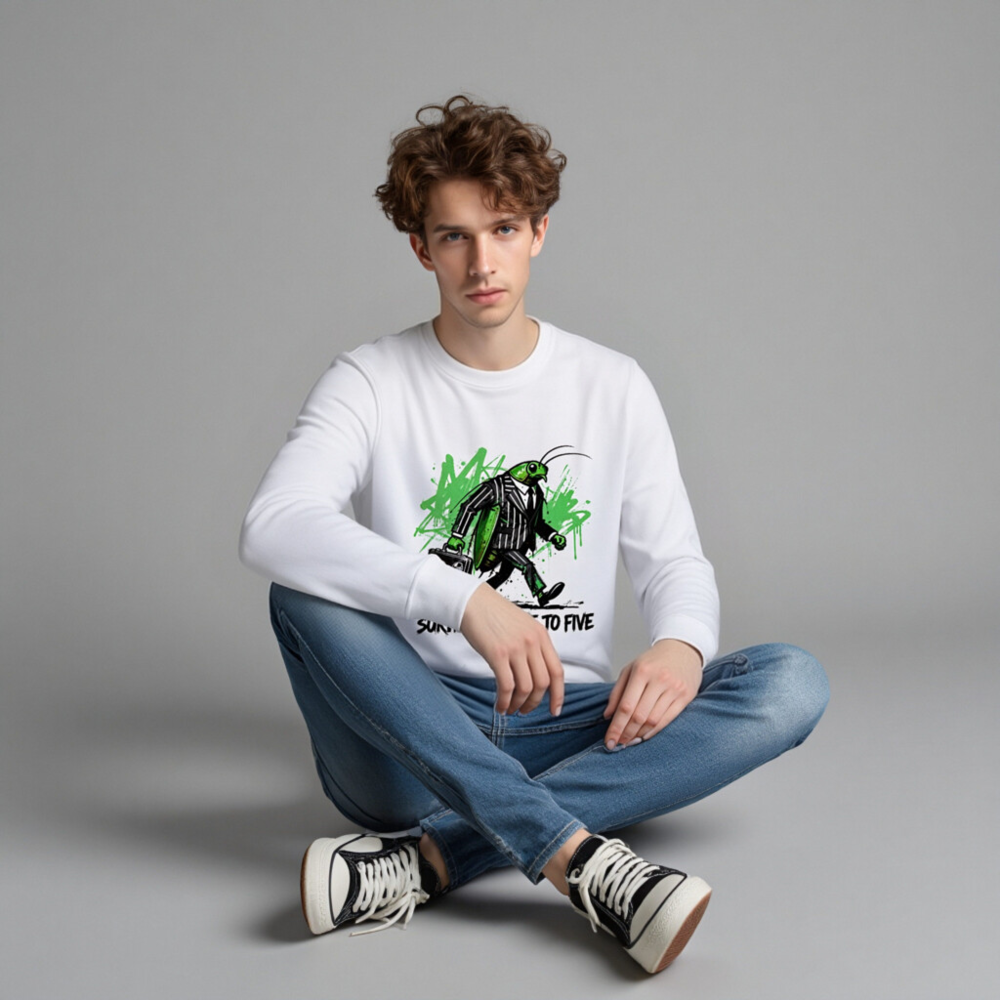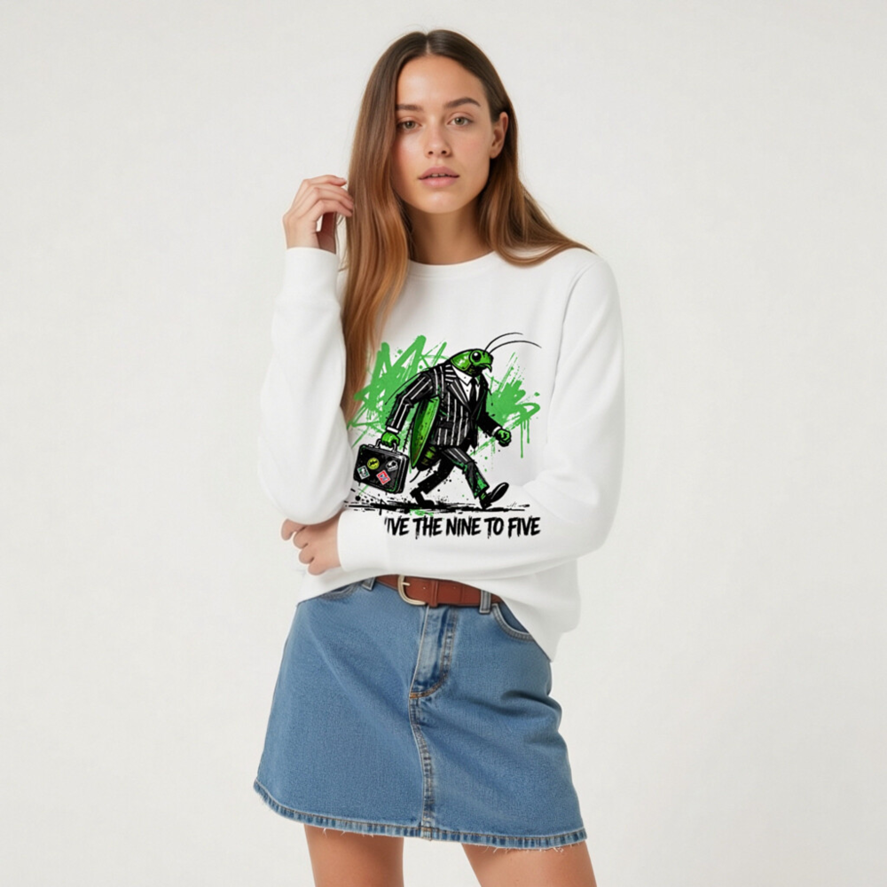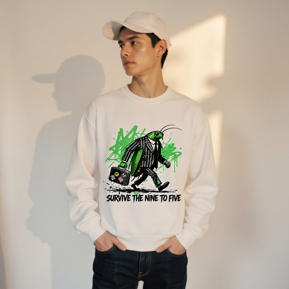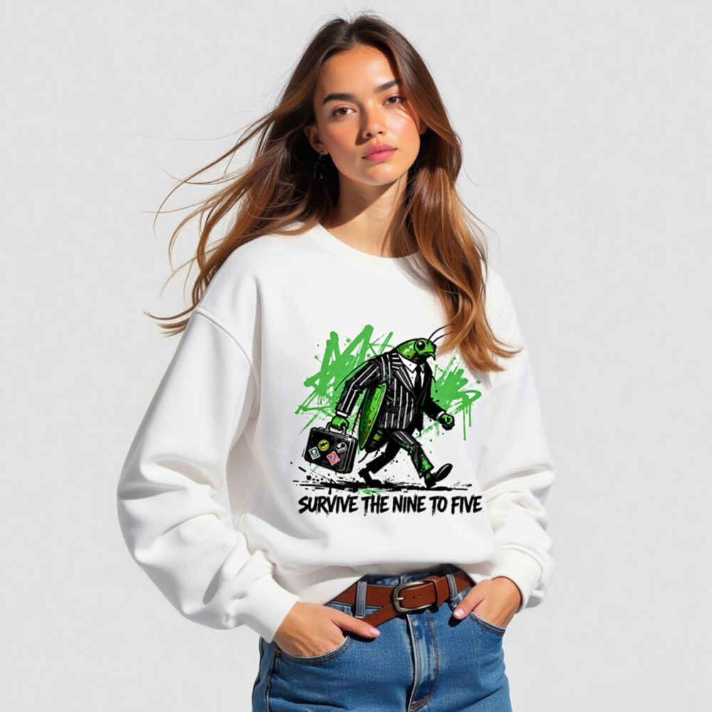Wear sustainable style with this unisex organic sweatshirt featuring a bold graphic of a green grasshopper in a pinstripe suit, carrying a vintage briefcase adorned with stickers. The design humorously captures the ‘survive the nine to five’ theme against vibrant green splatter art. Made from certified organic cotton, it’s soft, eco-friendly, and perfect for everyday comfort. Ideal for professionals, creatives, or anyone who loves quirky, meaningful apparel.