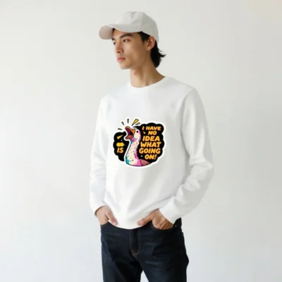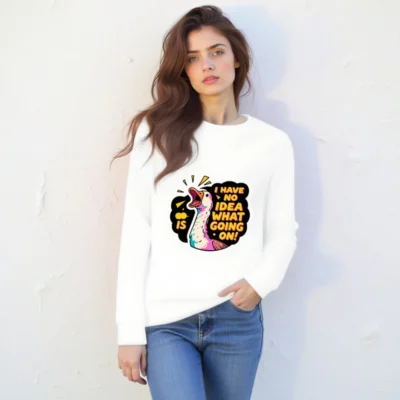 This unisex organic sweatshirt features a vibrant, comic-style duck with the playful phrase ‘I HAVE NO IDEA WHAT’S GOING ON!’—perfect for fans of quirky humor. Made from certified organic cotton, it offers comfort and sustainability without compromising on bold design. The eye-catching graphic includes dynamic yellow accents and a colorful feathered duck, ideal for casual wear. Eco-friendly, stylish, and ready to spark smiles.