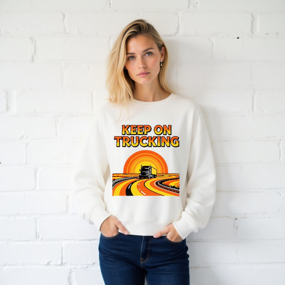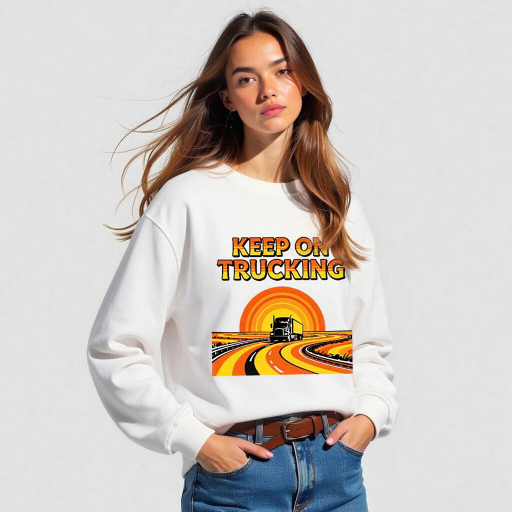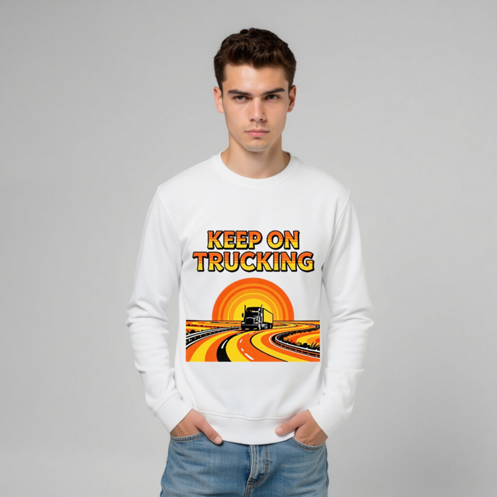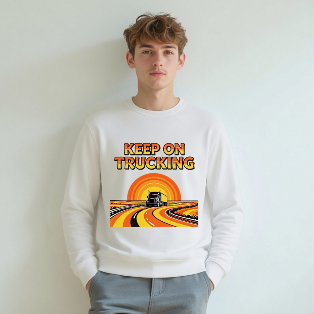 Wear the ‘Keep on Trucking’ vintage-style truck road design on this unisex organic sweatshirt. Made with 100% certified organic cotton, it features a retro sunset highway graphic and comfortable, eco-friendly construction. Ideal for truck lovers and road trip enthusiasts seeking sustainable fashion. Soft, durable, and proudly unisex.