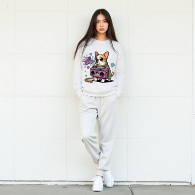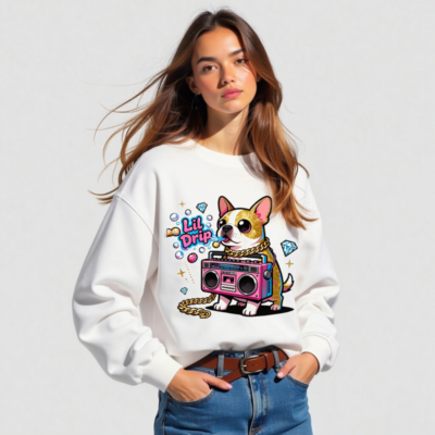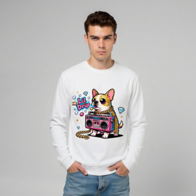 Show off your street style with this unisex organic sweatshirt featuring a vibrant ‘Lil Drip’ French Bulldog holding a pink-and-blue boombox, adorned with gold chain and sparkling diamonds. Soft, eco-friendly cotton blend—comfortable for everyday wear. Perfect for fans of urban pet art and retro hip-hop vibes.