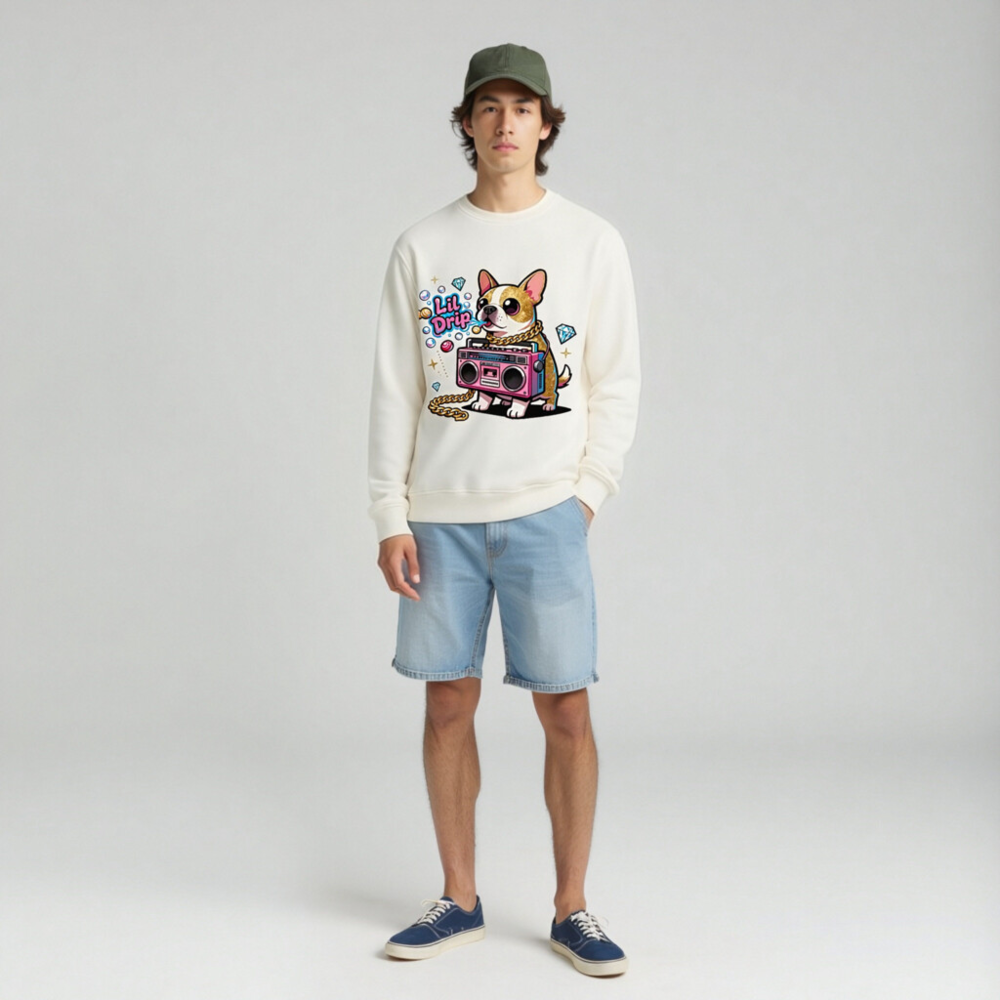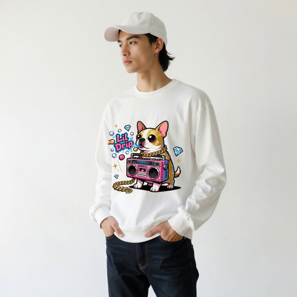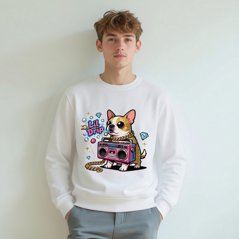Show off your street style with this unisex organic sweatshirt featuring a vibrant ‘Lil Drip’ French Bulldog holding a pink-and-blue boombox, adorned with gold chain and sparkling diamonds. Soft, eco-friendly cotton blend—comfortable for everyday wear. Perfect for fans of urban pet art and retro hip-hop vibes.