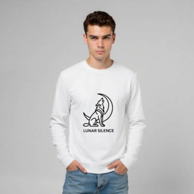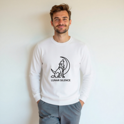 Wear sustainable style with this unisex organic sweatshirt—soft, eco-friendly cotton blend, certified GOTS. Features a striking black line-art wolf howling at the crescent moon, symbolizing ‘Lunar Silence’. Designed for comfort and conscious living. Ideal for everyday wear or gifting. Machine washable, ethically produced.