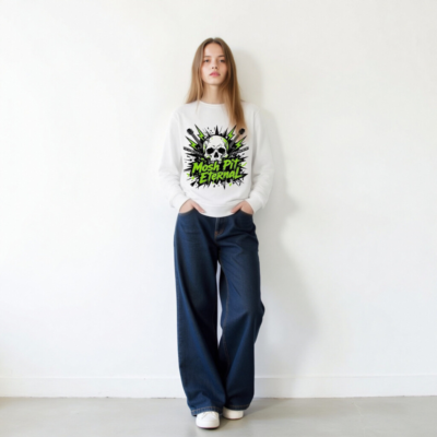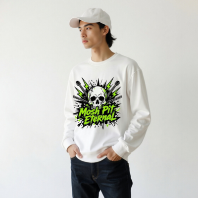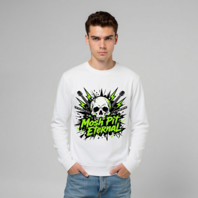 Wear the ‘Mosh Pit Eternal’ unisex organic sweatshirt — a bold, eco-conscious piece featuring a striking skull, electric guitars, lightning bolts, and chains in high-contrast black, white, and neon green. Made from certified organic cotton for comfort and sustainability. Ideal for rock fans, concertgoers, and ethical fashion lovers. Perfect for everyday wear or music festival style.