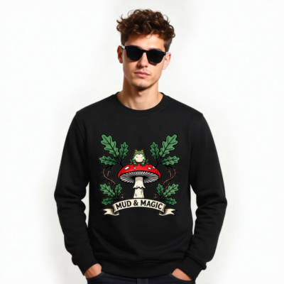 Eco-friendly unisex organic sweatshirt featuring a charming frog perched on a red-and-white mushroom, surrounded by oak leaves and vines. Soft, sustainable cotton blend with ‘Mud & Magic’ banner—perfect for nature lovers. Certified organic (GOTS) and ethically produced. Comfortable fit, durable print, ideal for everyday wear.