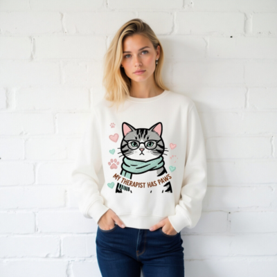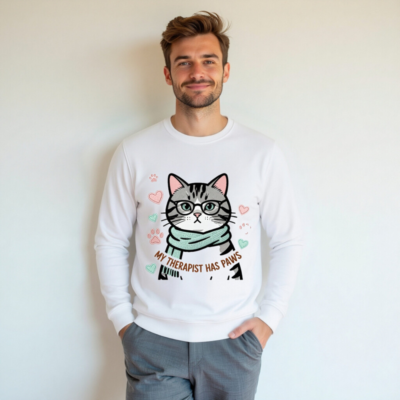 Wear comfort and compassion with this unisex organic sweatshirt featuring a charming tabby cat in glasses and a scarf, surrounded by hearts and paw prints. The playful ‘My Therapist Has Paws’ slogan makes it a perfect gift for cat lovers. Crafted from certified organic cotton for softness and sustainability. Ideal for everyday wear — gentle on skin, kind to the planet.