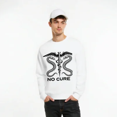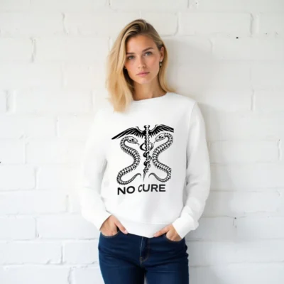 Wear ethical style with this unisex organic sweatshirt featuring a bold ‘NO CURE’ caduceus design—two skeletal snakes coiled around a winged staff. Made from certified organic cotton for comfort and sustainability. Ideal for medical professionals, activists, or anyone advocating for health equity. Soft, durable, and eco-conscious—no synthetic blends, no harmful dyes.