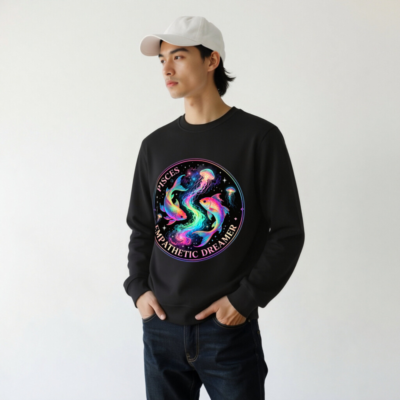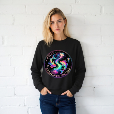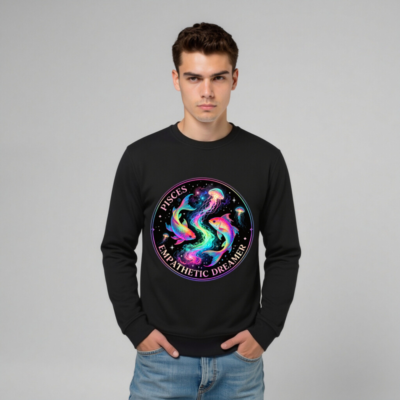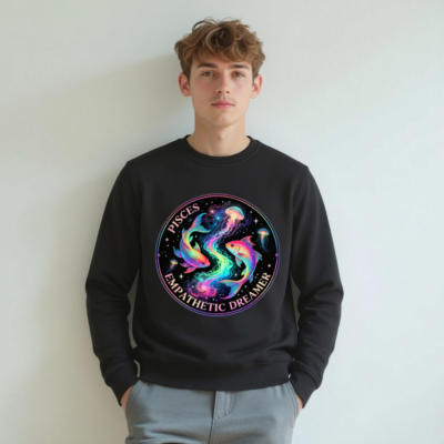 Celebrate your Pisces spirit with this unisex organic sweatshirt featuring a vibrant, cosmic design of rainbow koi fish and jellyfish swirling amid stars. The ‘Pisces Empathetic Dreamer’ circular motif captures the zodiac’s intuitive, dreamy essence. Soft, sustainable cotton blend — eco-conscious style for dreamers and empathetic souls. Perfect for astrology lovers seeking meaningful, high-quality apparel.