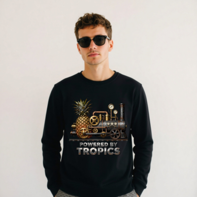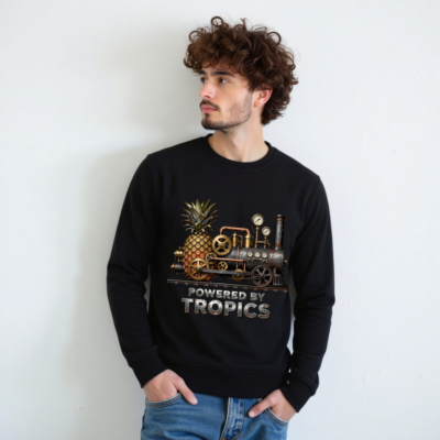 A unisex organic sweatshirt featuring a steampunk pineapple train design with brass gears, pressure gauges, and rustic metal textures. Soft, eco-friendly cotton blend—certified organic (GOTS) for sustainable comfort. Bold ‘Powered by Tropics’ slogan adds playful tropical flair. Ideal for casual wear, gifts, or steampunk enthusiasts. Machine-washable, ethically produced.