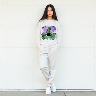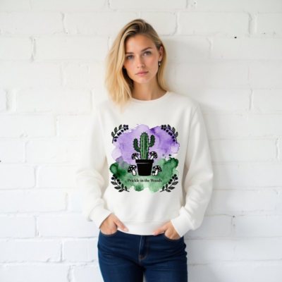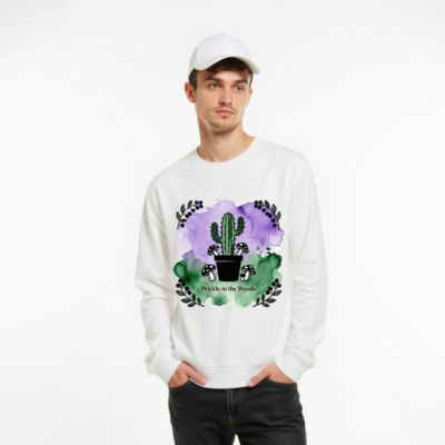 Wear nature’s charm with this unisex organic sweatshirt—featuring a whimsical ‘Prickle in the Woods’ design: a potted cactus, woodland mushrooms, and berry vines on soft purple-green watercolor. Made from certified organic cotton (verified by GOTS), it’s comfortable, sustainable, and perfect for eco-conscious fashion lovers seeking unique, artistic apparel.
