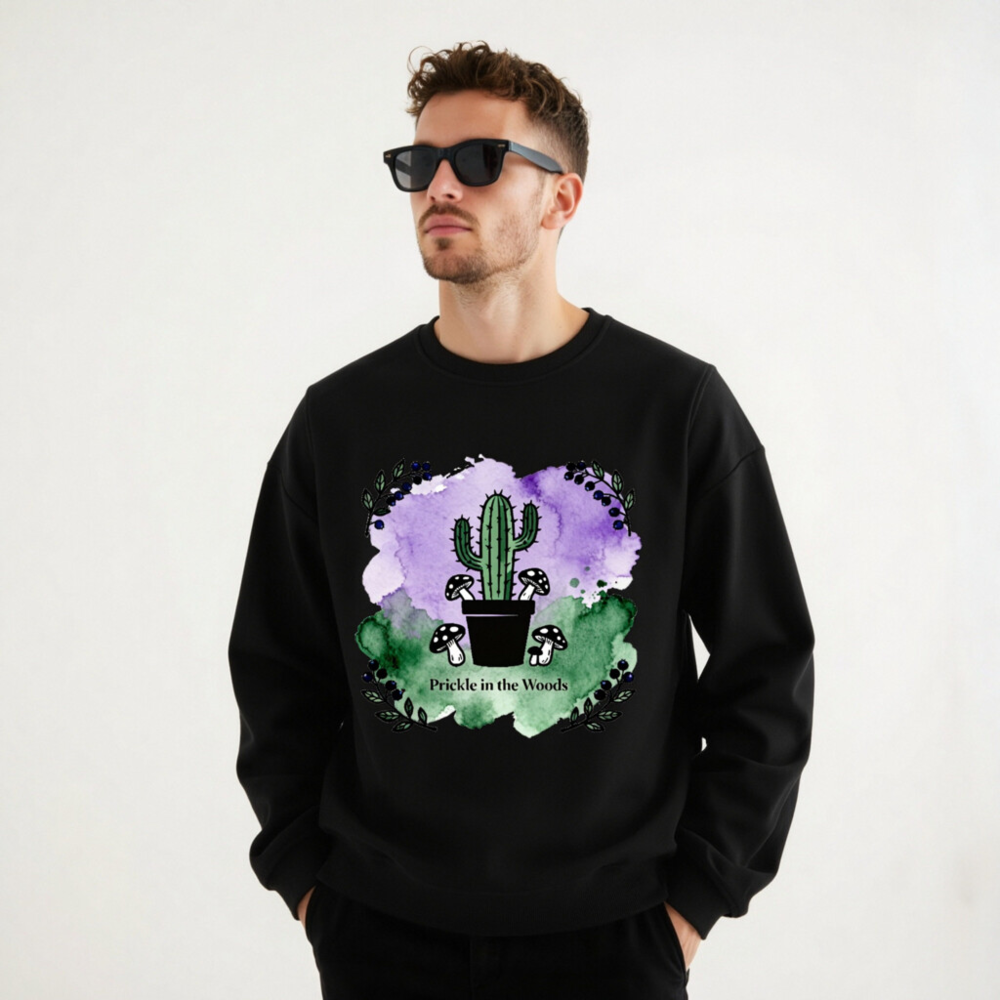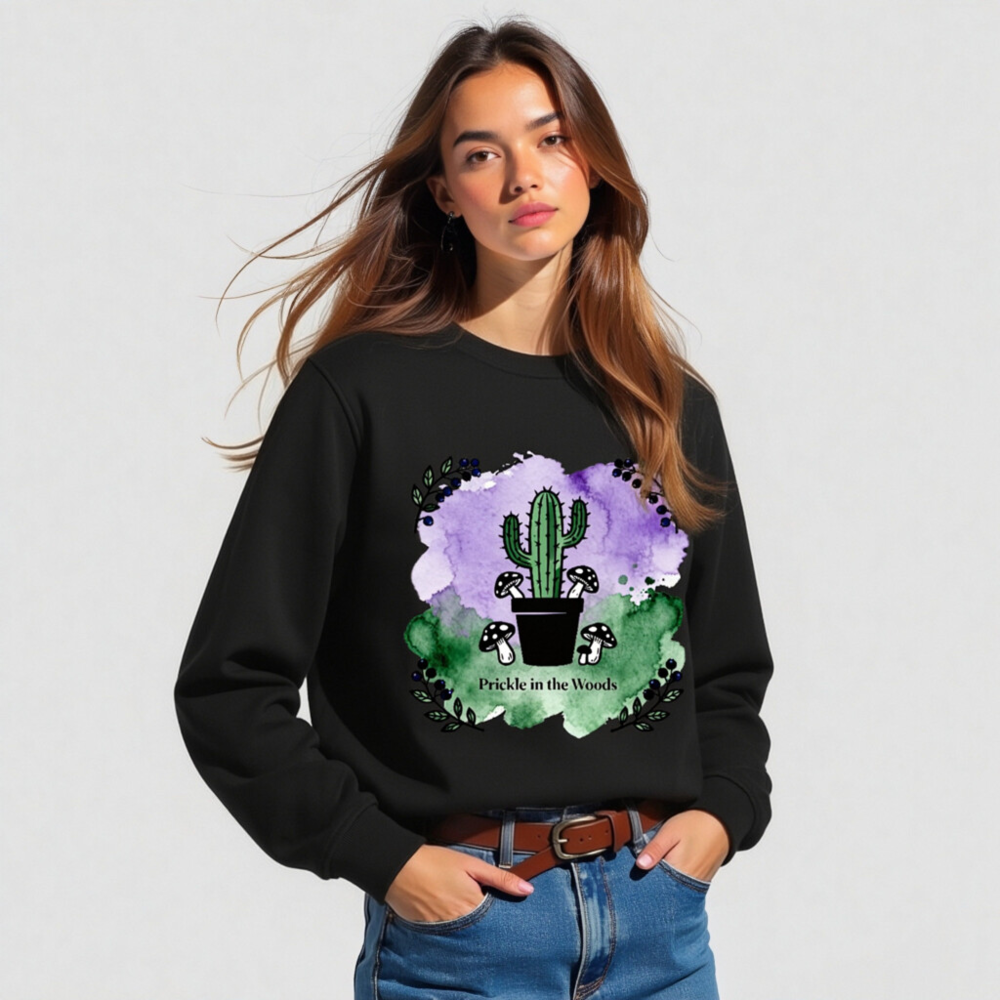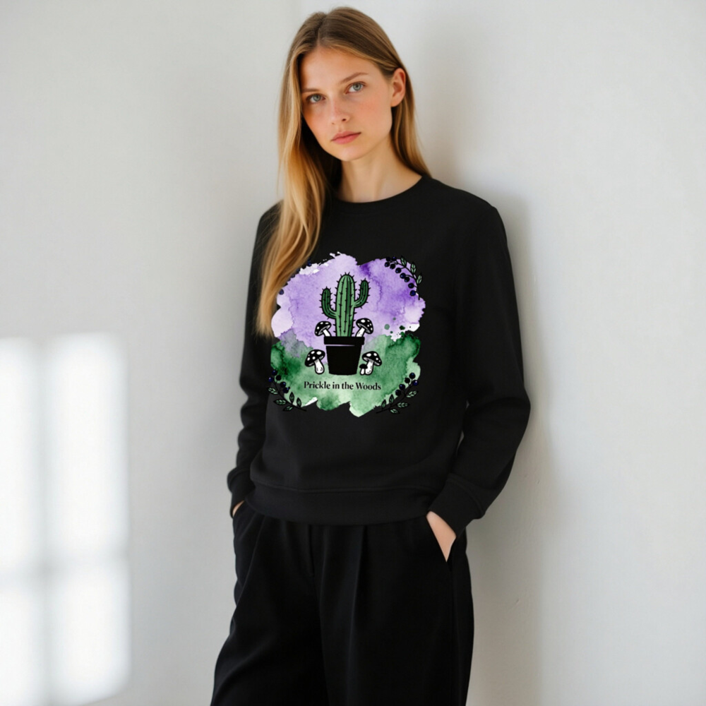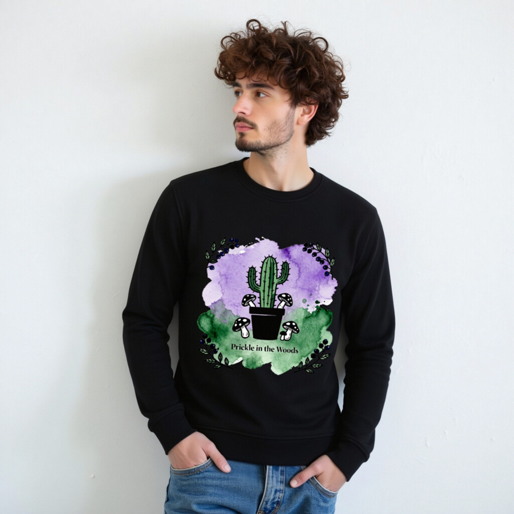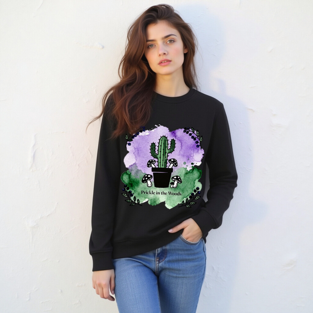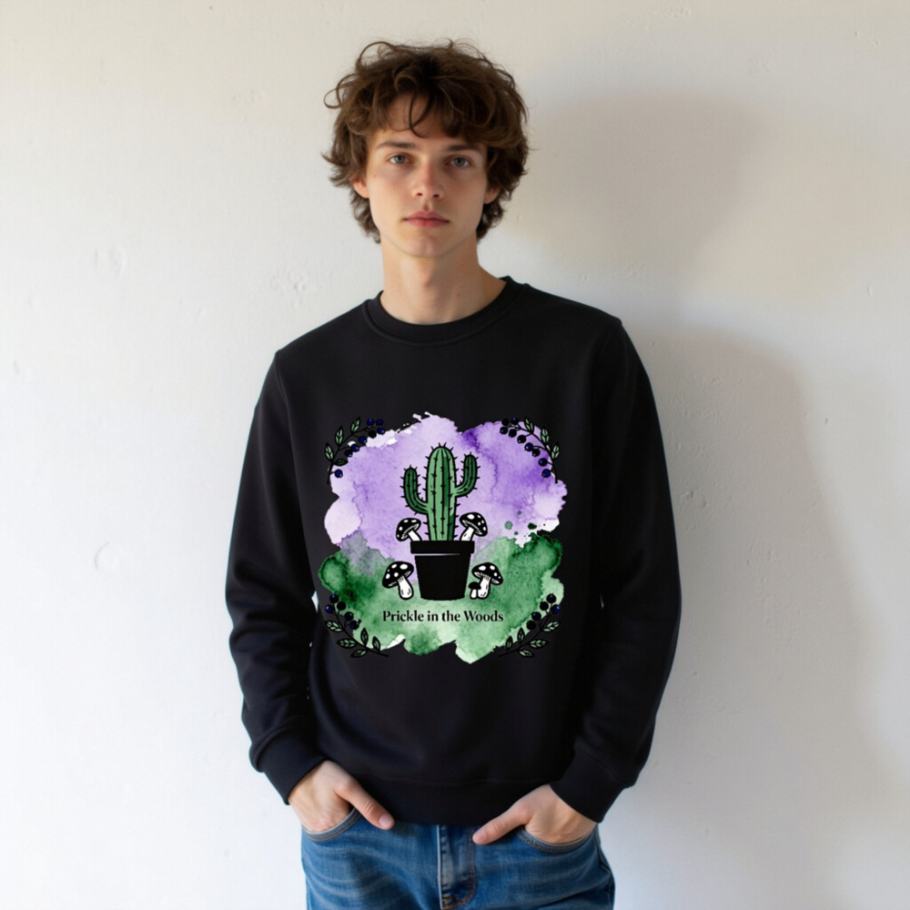 Wear nature’s charm with this unisex organic sweatshirt—featuring a whimsical cactus, woodland mushrooms, and watercolor purple-green backdrop. Made from certified organic cotton (verified by standard not specified in prompt), it’s soft, sustainable, and perfect for eco-conscious style. The ‘Prickle in the Woods’ design blends desert and forest motifs for unique, eye-catching appeal.